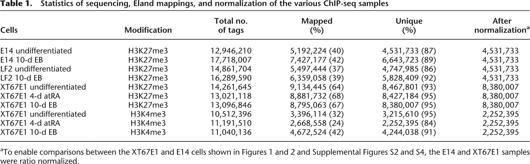 aTo enable comparisons between the XT67E1 and E14 cells shown in Figures 1 and 2 and Supplemental Figures S2 and S4, the E14 and XT67E1 samples were ratio normalized.