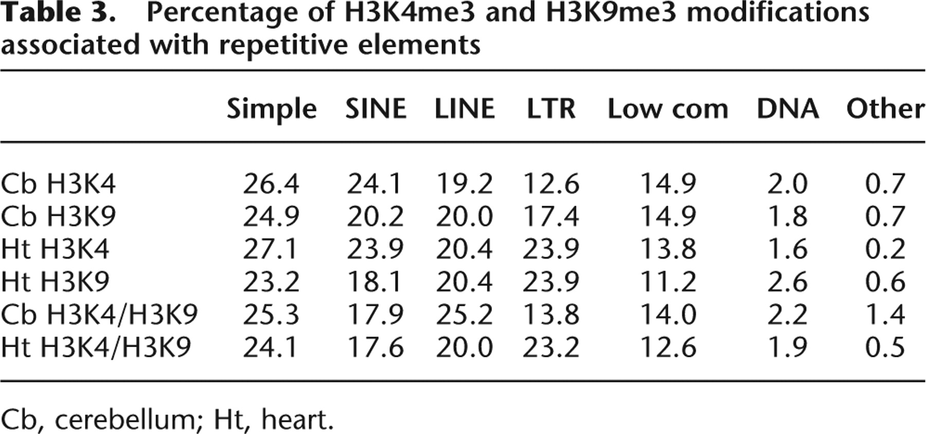 Percentage of H3K4me3 and H3K9me3 modifications associated with repetitive elements
