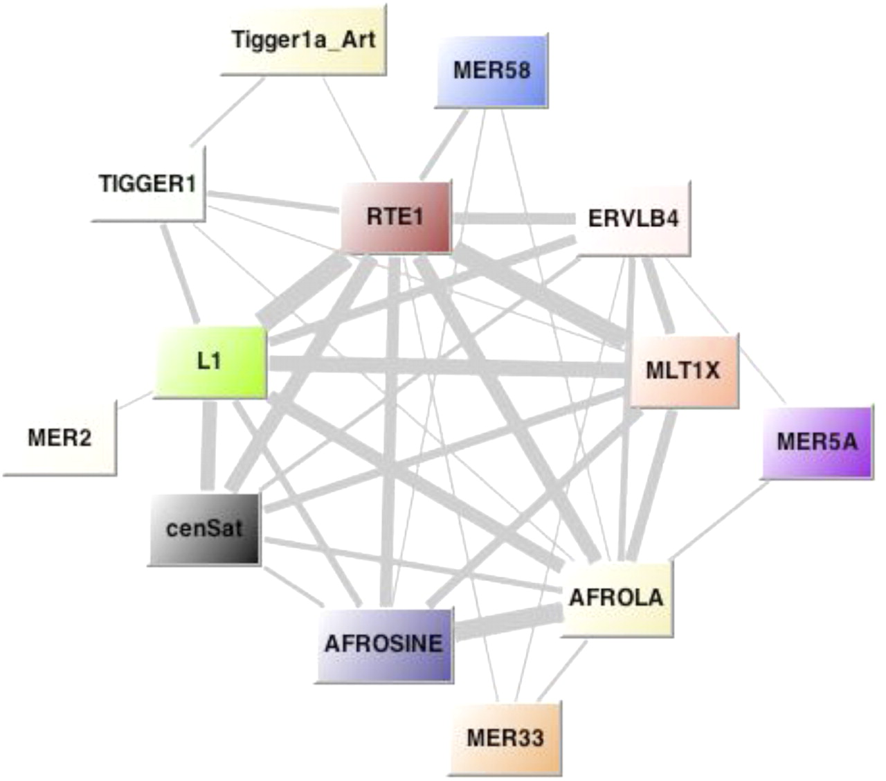 Chromosomal associations among various types of interspersed repeats. The network was constructed with the reads from sample M25. A node represents a repeat class; a line represents the connection between two types of repeats, which was estimated by the number of reads that contain both kinds of repeats. The width of the line is proportional to the number of connections.