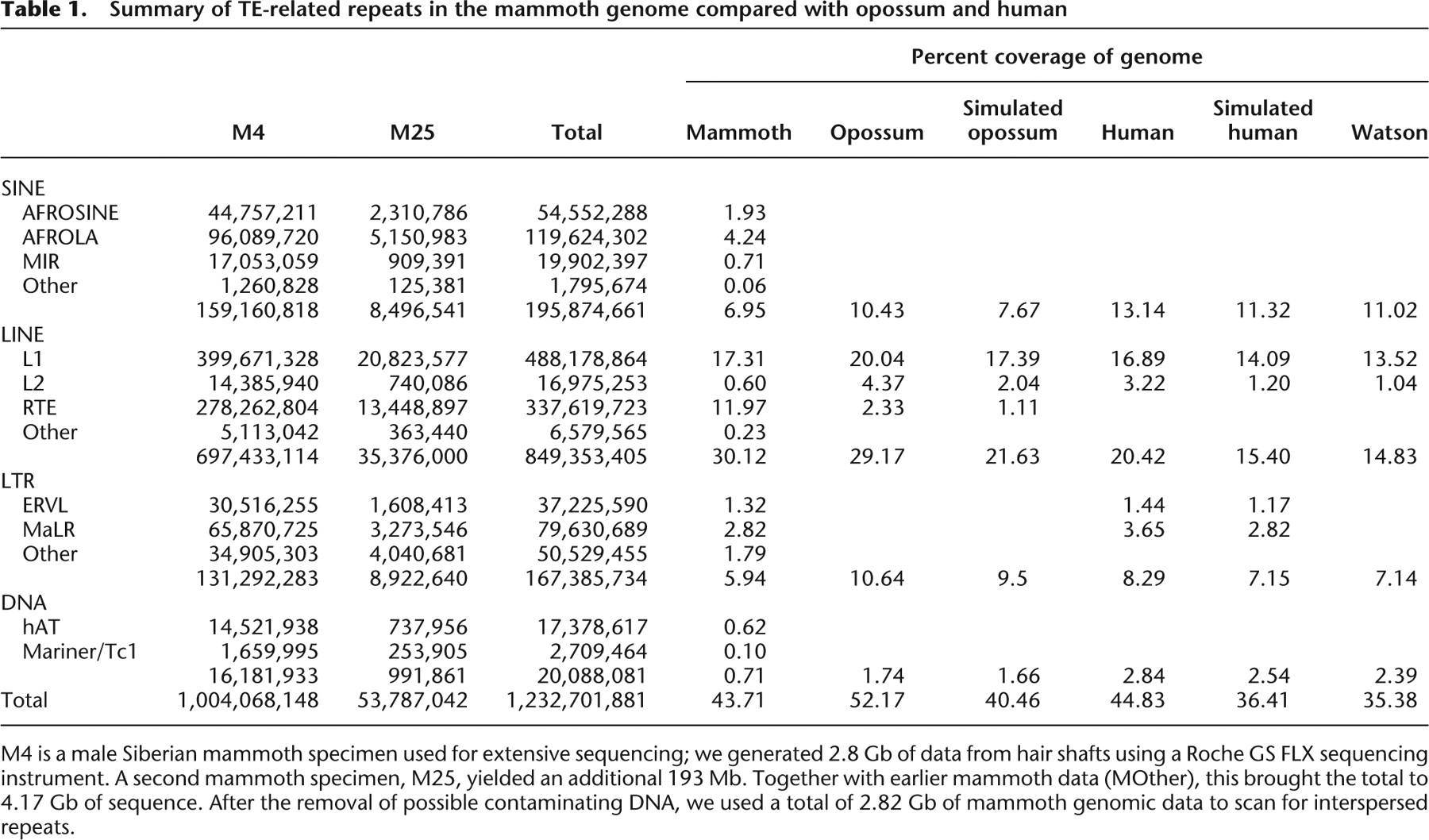 M4 is a male Siberian mammoth specimen used for extensive sequencing; we generated 2.8 Gb of data from hair shafts using a Roche GS FLX sequencing instrument. A second mammoth specimen, M25, yielded an additional 193 Mb. Together with earlier mammoth data (MOther), this brought the total to 4.17 Gb of sequence. After the removal of possible contaminating DNA, we used a total of 2.82 Gb of mammoth genomic data to scan for interspersed repeats.