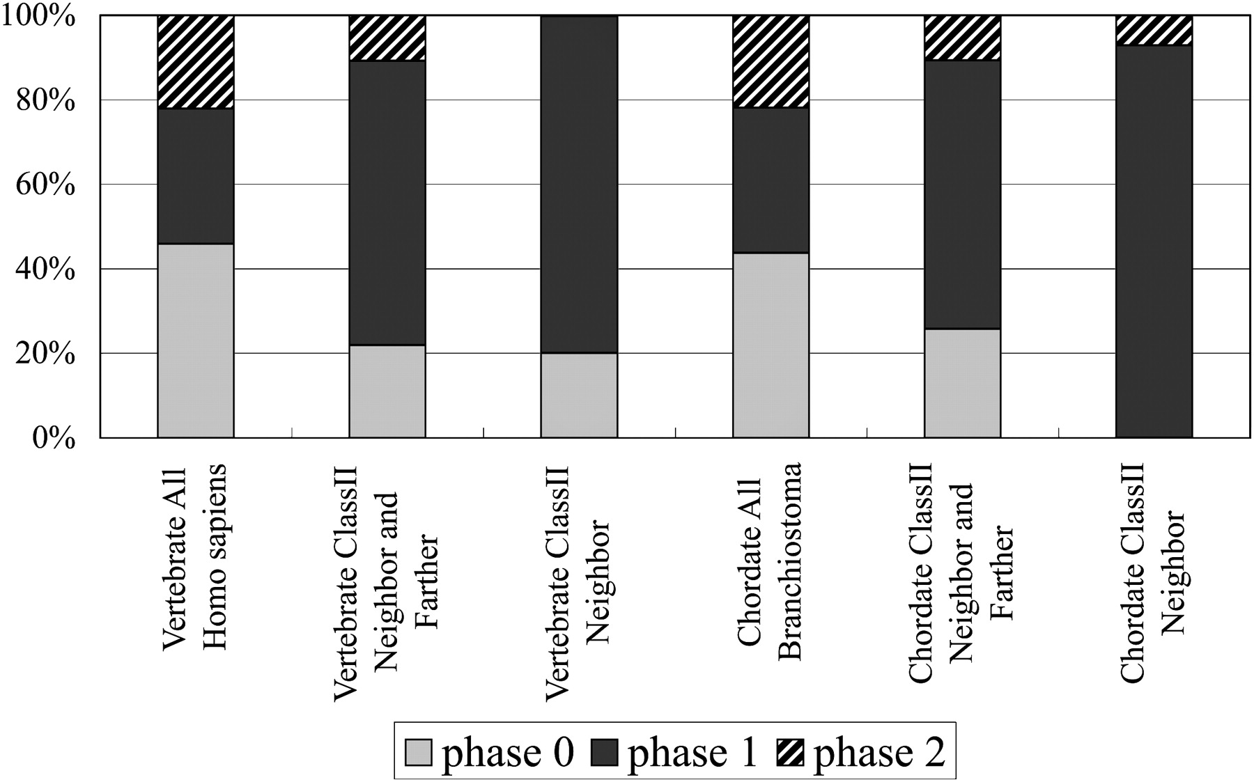 Phase of introns involved in domain shuffling. The intron phases of exons that encode the C terminus of domain 1 and that of the N terminus of domain 2 were counted here. Although the phase 0 intron is dominant in the gene models of Homo and Branchiostoma, the phase 1 intron is dominant in the class II pairs. The intron phase of the class II pairs was analyzed using the human gene models. Details of the data are given in Supplemental Tables 5 and 7.