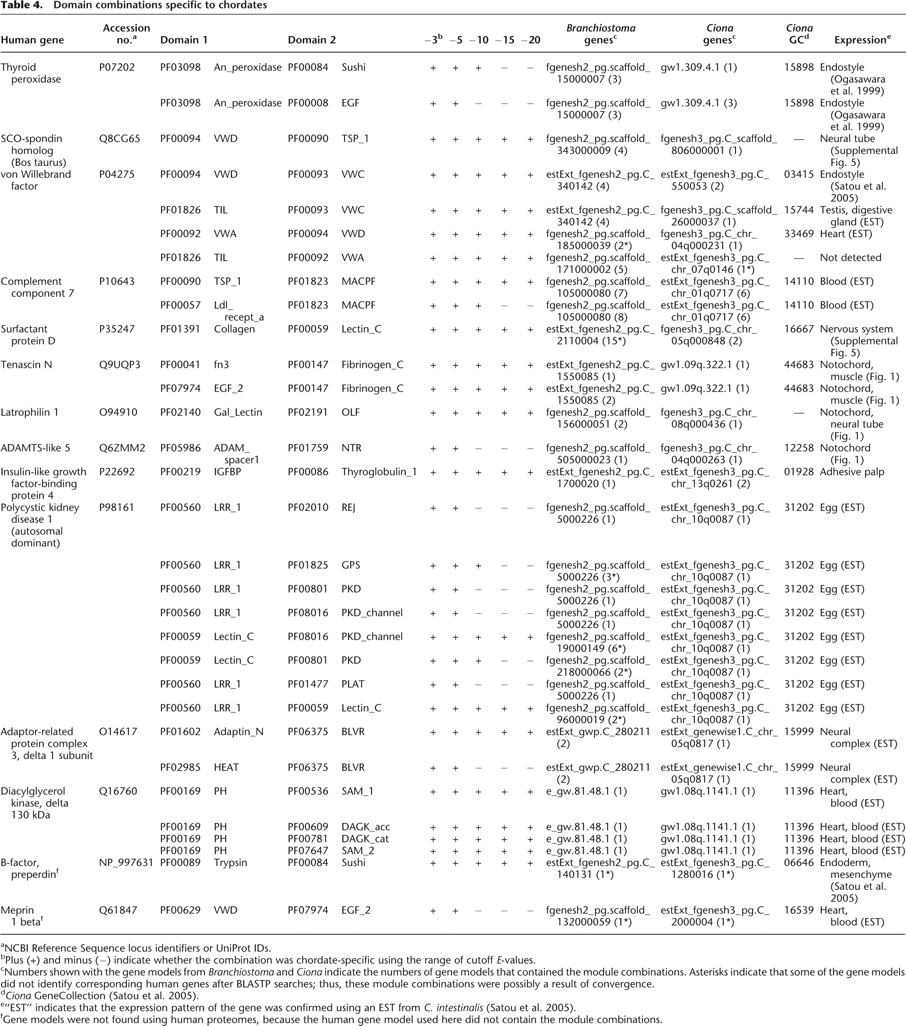 bPlus (+) and minus (−) indicate whether the combination was chordate-specific using the range of cutoff E-values.