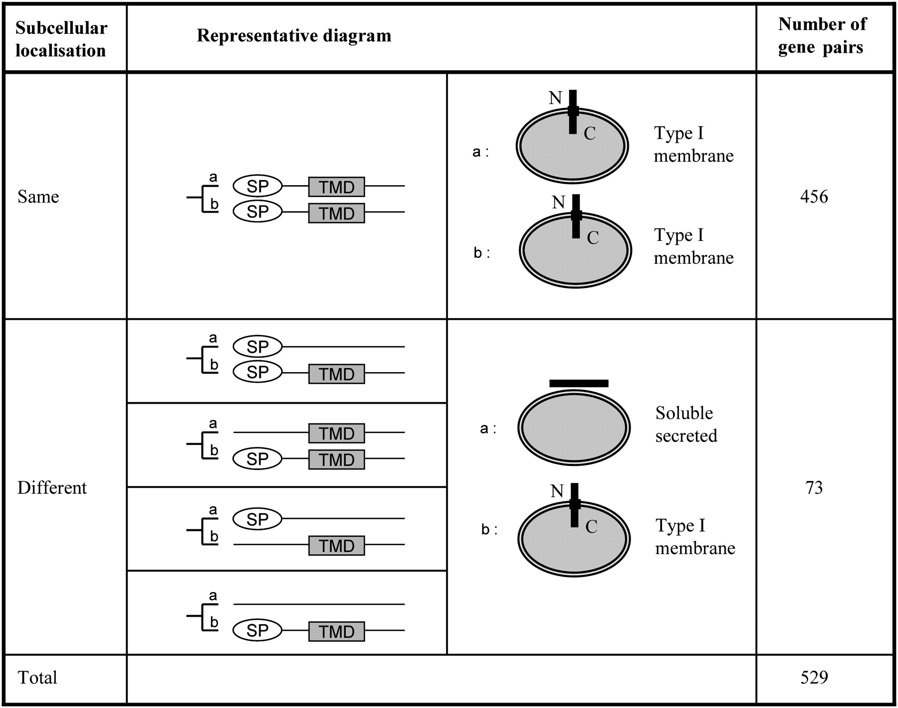 Comparison of the subcellular localization of proteins encoded by zebrafish WGD-duplicates. Subcellular localization was assessed using computational methods, SignalP (Bendtsen et al. 2004) and TMHMM (Krogh et al. 2001). 14% of WGD-duplicates encode proteins that differ in subcellular localization.