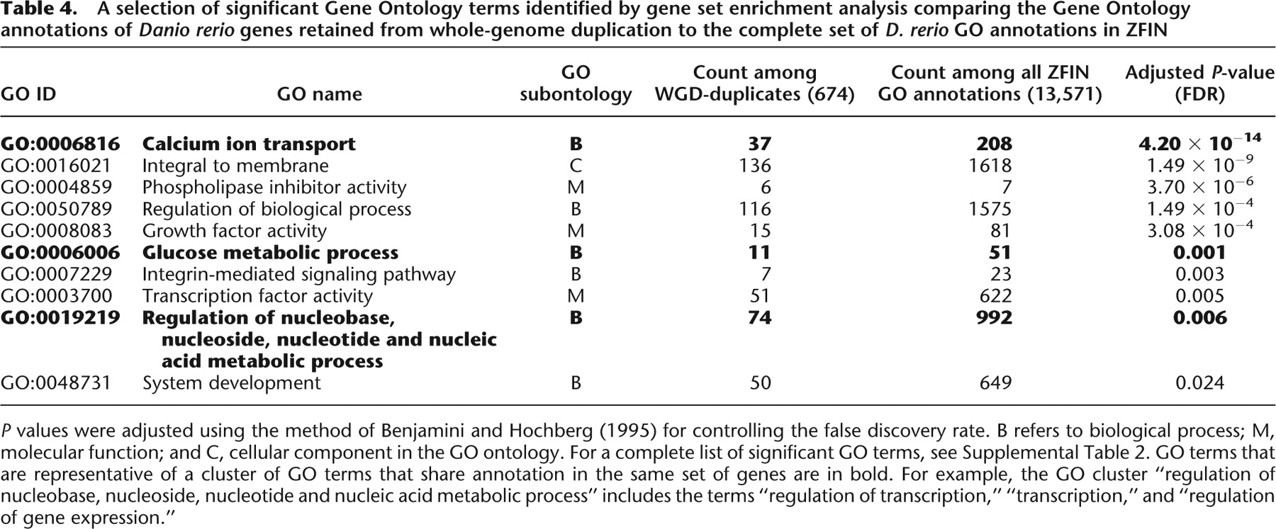 A selection of significant Gene Ontology terms identified by gene set enrichment analysis comparing the Gene Ontology annotations of Danio rerio genes retained from whole-genome duplication to the complete set of D. rerio GO annotations in ZFIN