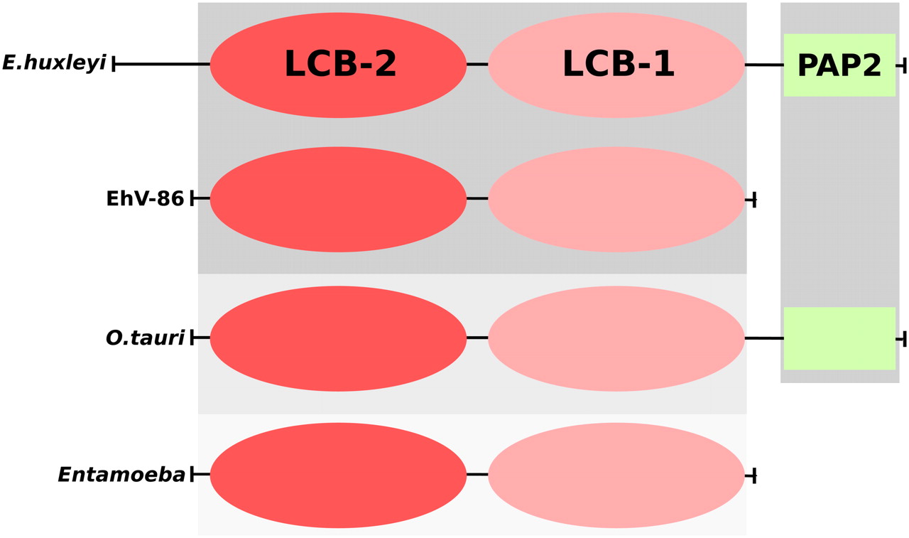 Domain architectures of serine palmitoyltransferases from E. huxleyi, EhV-86, O. tauri, and Entamoeba spp. LCB2-like domains correspond to red ovals; LCB1-like domain, pink ovals; and PAP2 domains, green rectangles. Background gray scales correspond to the level of sequence similarity from the E. huxleyi SPT sequence (darker gray for higher BLAST scores).
