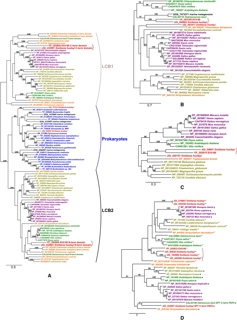 Maximum likelihood phylogenetic trees based on the amino acid sequences of the four central enzymes in the sphingolipid biosynthesis pathway. (A) Serine palmitoyltransferase LCB1 and LCB2 domain sequences and their homologs. (B) Dihydroceramide synthases (LAG1). (C) Dsd1-like fatty acid desaturases. (D) Lipid phosphate phosphatase (LPP), the PAP2-domain sequence from the E. huxleyi SPT, and their homologs. These trees are unrooted per se, although we have arbitrarily chosen a root (mostly by mid-point rooting) for each tree only for visualization purpose. The number of substitutions per site is indicated under the scale bar. In D, (#) sequences best hitting to sphingosine 1-phosphate phosphatases (cd03388) after NCBI/CDD searches; (*) sequences best hitting to phosphatidic acid phosphatases (cd03390); (§) sequences best hitting to the wunen subfamily sequences (a family of membrane associated phosphatidic acid phosphatases; cd03384).