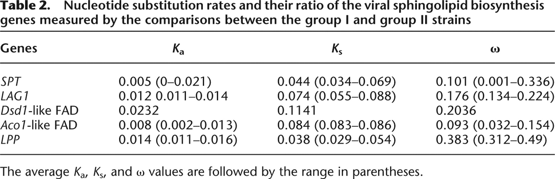 Nucleotide substitution rates and their ratio of the viral sphingolipid biosynthesis genes measured by the comparisons between the group I and group II strains