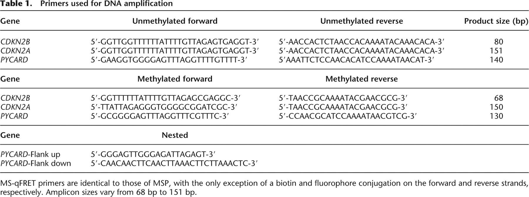 MS-qFRET primers are identical to those of MSP, with the only exception of a biotin and fluorophore conjugation on the forward and reverse strands, respectively. Amplicon sizes vary from 68 bp to 151 bp.