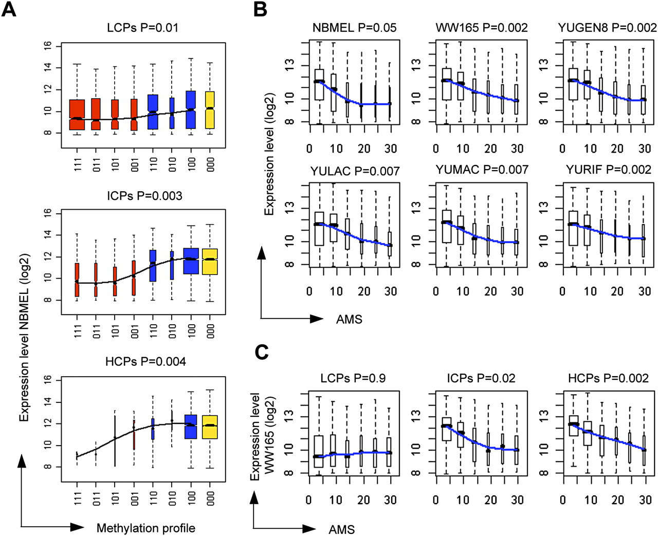 Promoter methylation and transcriptional repression. (A) Gene expression in normal melanocytes (NBMEL) under the control of promoters with each methylation profile in each promoter category; red and blue groups indicate promoters with and without proximal methylation (XX1 and XX0 profiles, respectively); yellow indicates unmethylated promoters; the groups range from fully methylated to unmethylated from left to right, and the order is based on the progressive absence of methylation from distal to proximal regions; smoothing over the median for each group is shown. (B) Gene expression in normal melanocytes (NBMEL) and five melanoma cell strains as a function of the probe-level AMS of proximal promoters; smoothing over the median for each group is shown. (C) Gene expression of WW165 primary melanoma cells for each promoter category as a function of the probe-level AMS of proximal promoters; smoothing over the median for each group is shown. For each panel the trend P-value is indicated (see Methods).