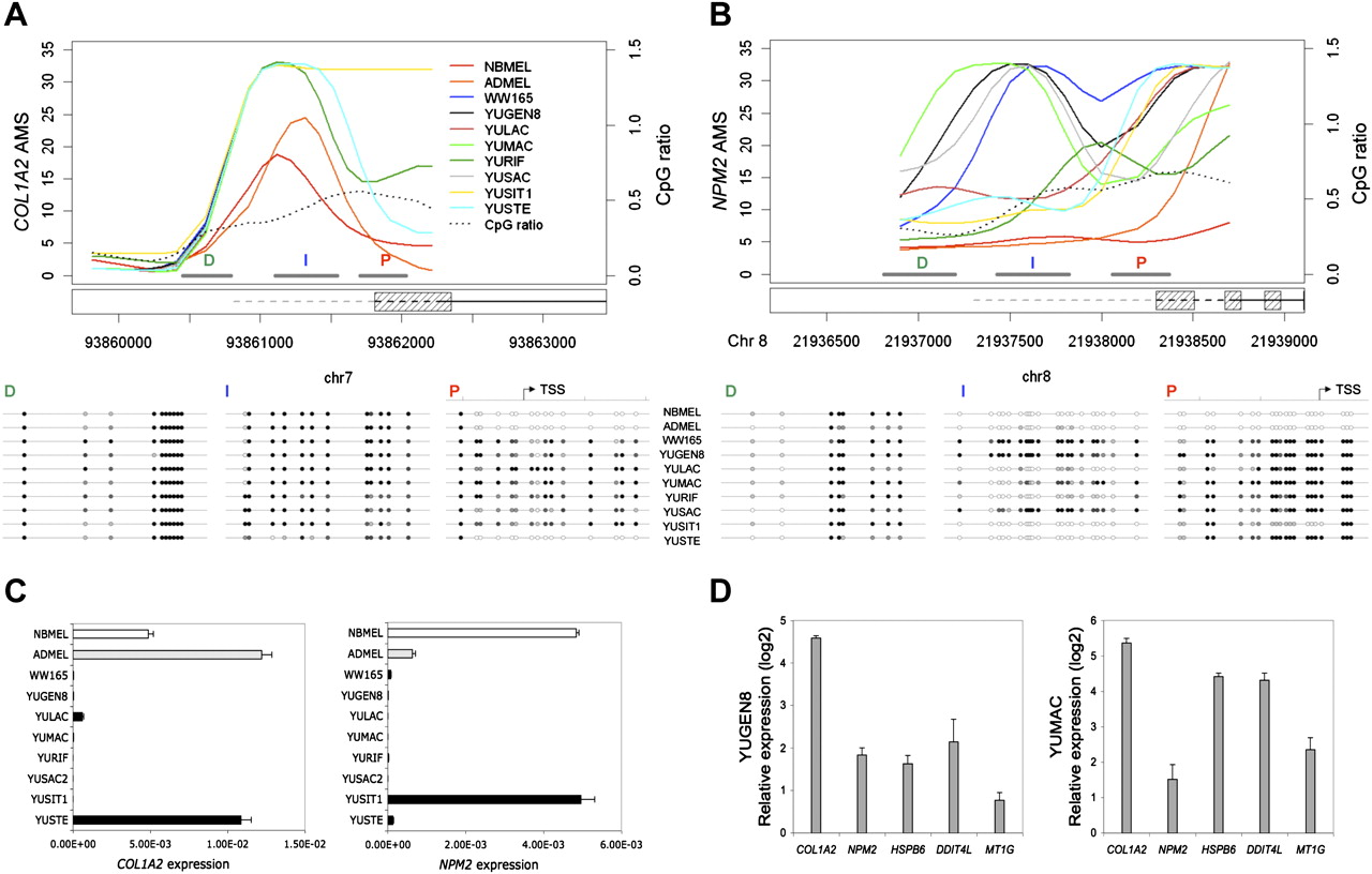 Promoter methylation and gene expression for selected markers. (A) Probe-level AMS, CpG ratio, and sequence of BS-modified genomic DNA for the proximal (P), intermediate (I), and distal (D) promoter regions of COL1A2 in newborn (NBMEL) and adult (ADMEL) melanocytes and eight melanoma cell strains; gray bars indicate the amplicons of BS sequencing; D, distal, I, intermediate, and P, proximal for each promoter region; 1 kb upstream region (dashed line), exon (dashed box), and coding sequences (solid black line) for each RefSeq in the locus are displayed; CpGs are represented as circles, and white, gray, and black shades refer to the average of mCpG/CpG (0 to 1) for each sample. (B) Same as A, for NPM2. (C) COL1A2 and NPM2 expression levels measured by real-time RT-PCR. Expression levels were normalized to that of ACTB. (D) Restoration of gene expression (COL1A2, DDIT4L, NPM2, and MT1G) after treatment with Aza (0.2 μM). Gene transcripts were measured by real-time RT-PCR, and expression levels were normalized to that of ACTB. The histogram shows log2 increase after Aza treatment for YUGEN8 and YUMAC melanoma cells.
