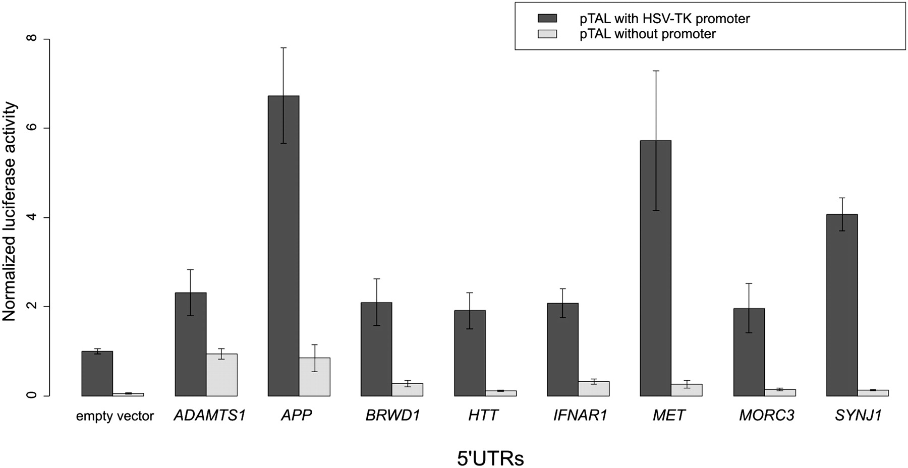In vitro measurement of the 5′ UTR effect on luciferase activity in the HeLa S3 cell line. To control for cryptic promoter activity, the pTAL promoter was deleted for each 5′ UTR. The y-axis shows the luciferase/Renilla ratio.
