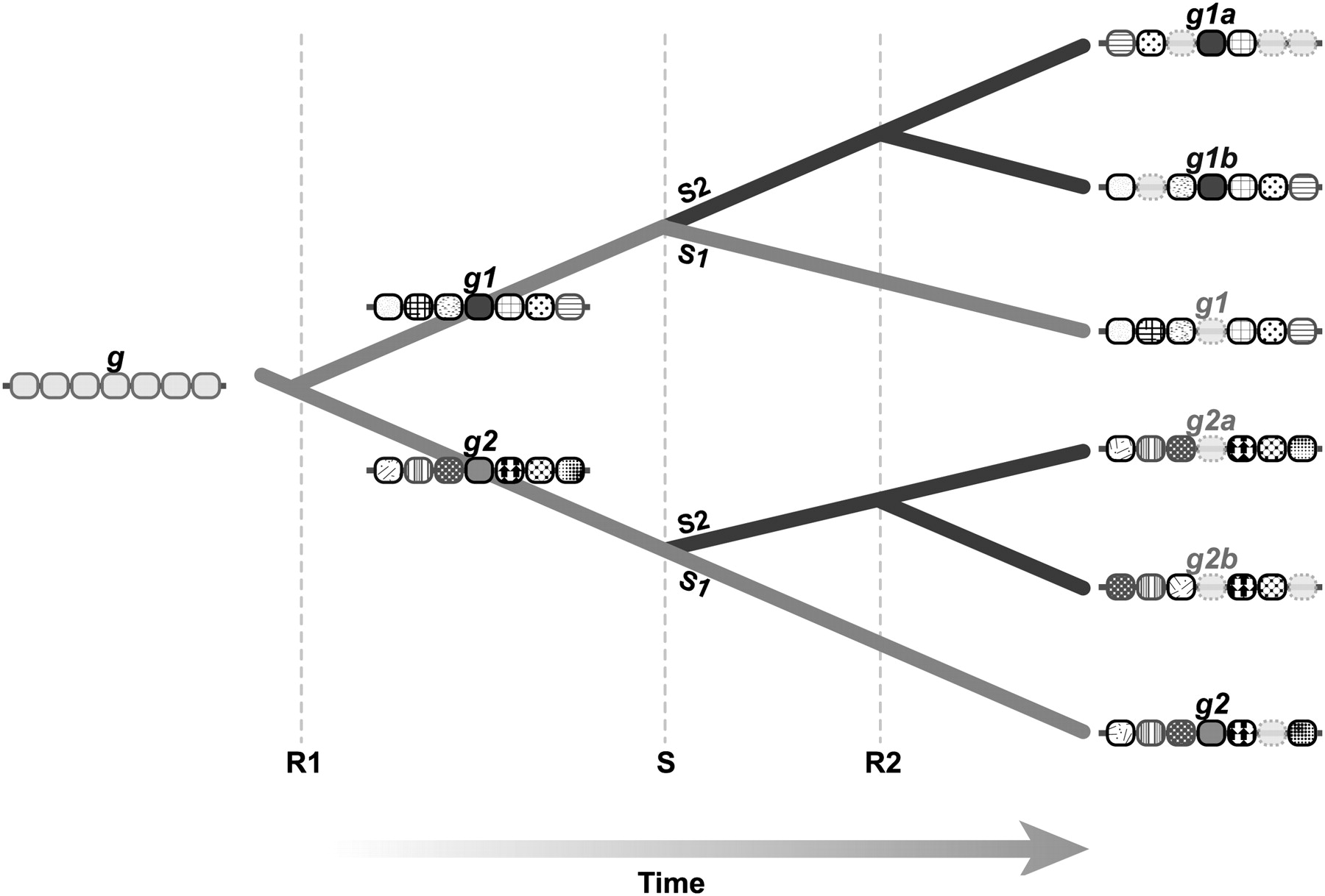 Differential gene loss following whole-genome duplication creates ohnologs gone missing. This image shows the evolutionary history of a gene g and neighbors undergoing a whole-genome duplication event (R1), a speciation event (S), and a second WGD event (R2) that occurs in only one of the descendant lineages, S2. If no changes to the order or composition of genes on the chromosomes occur over time, most algorithms would find that g1a and g1b are co-orthologous to g1, and that g2a and g2b are co-orthologous to g2. In a more realistic evolutionary history, gene losses and chromosomal rearrangements follow the genome duplication event, including a loss of g1 from the S1 lineage and g2a and g2b from the S2 lineage. Due to these losses, orthology assignment algorithms will usually infer that g1a and g1b are co-orthologous to g2, incorrectly assigning co-orthology where there is none. Extinct genes are shown in gray.