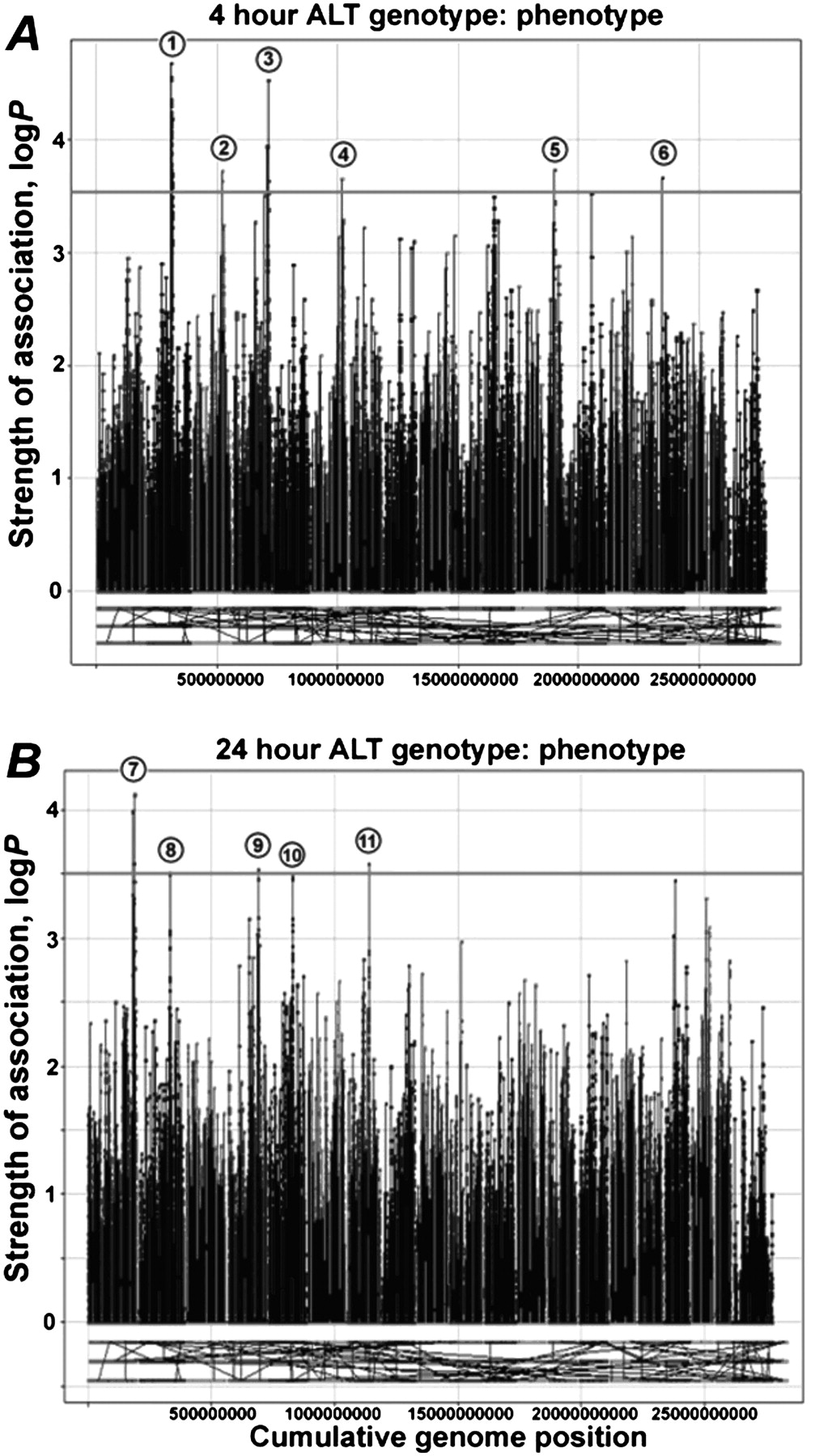 Haplotype association mapping of acetaminophen-induced liver injury in the mouse. Serum ALT at 4 h (A) and 24 h (B) after acetaminophen (300 mg/kg) treatment was used to identify genomic intervals significantly associated with liver injury. Peaks (numbered, see Table 1) indicate a significant logP association score at each 3-SNP marker window. Marker colors indicate chromosome number across the mouse genome.