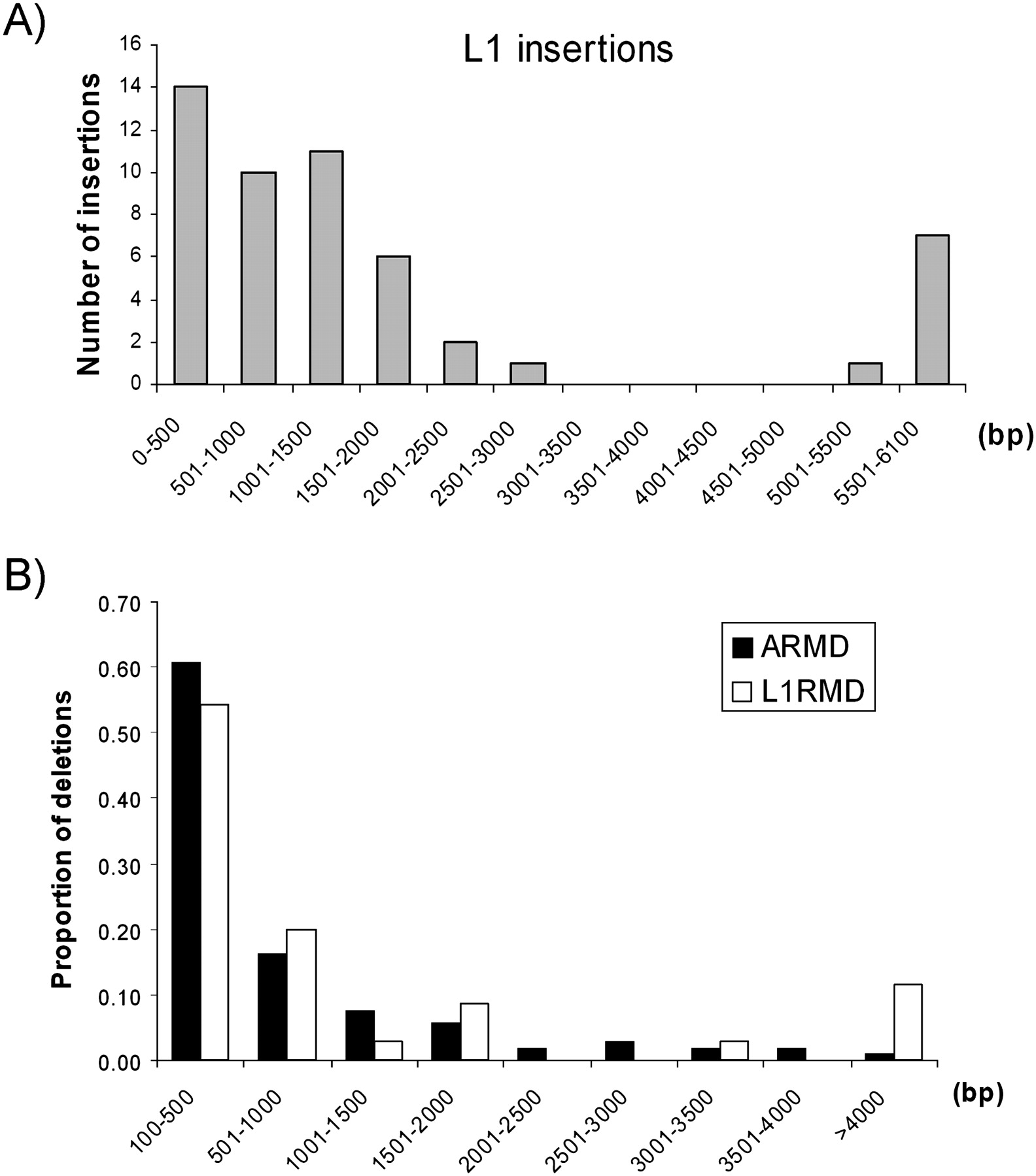 (A) Size distribution of L1 insertions. The number of insertions in 500-bp bins is shown. (B) Size distribution of Alu- and L1-mediated deletions. The percentage of total events in 500-bp bins (except the last one) is shown.