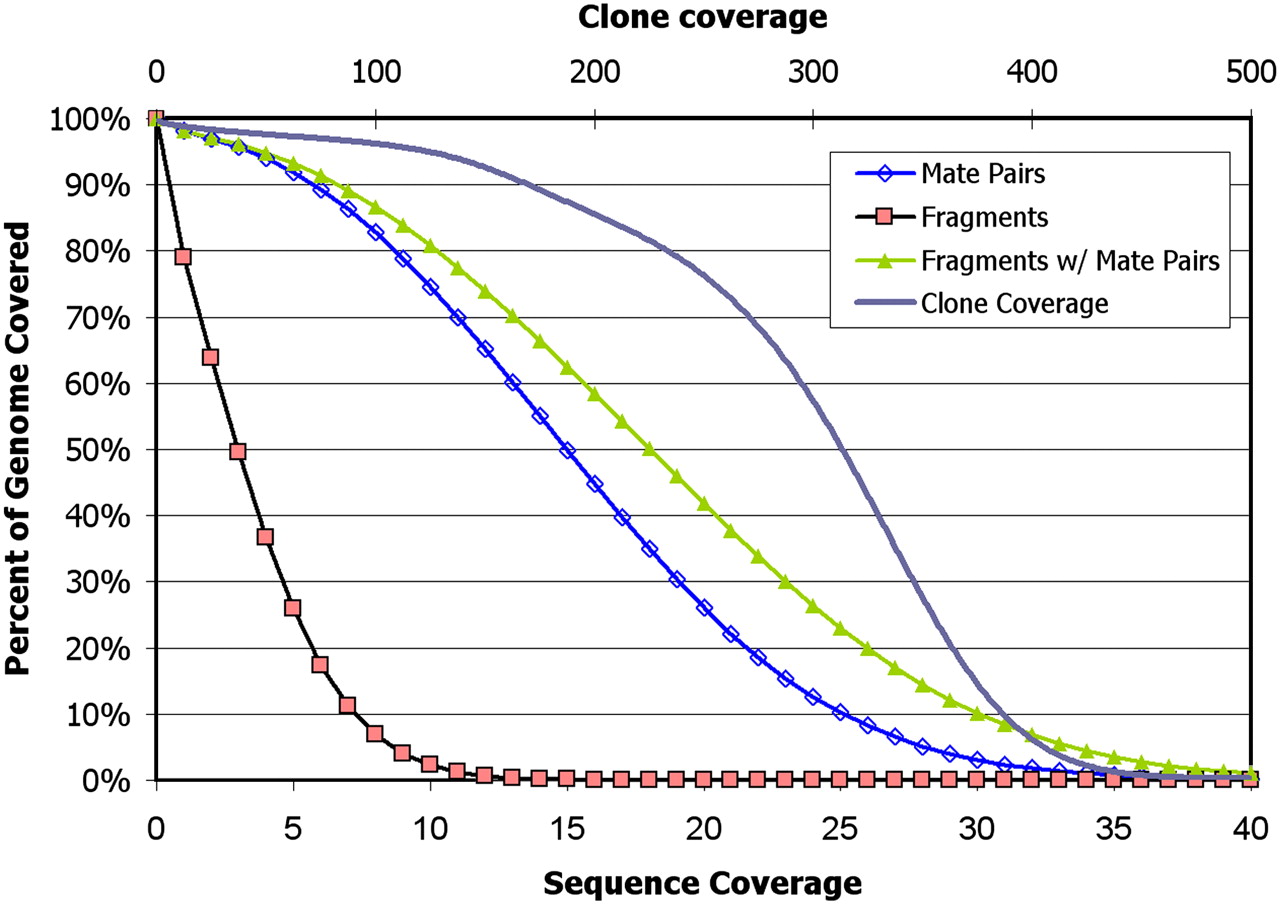 Cumulative plot of sequence and clone coverage from uniquely placed fragments and uniquely placed mate pairs. The sequence coverage is derived from the fragment, 2 × 25 mate-paired, and 2 × 50 mate-paired libraries while the clone coverage is from only the mate-paired libraries (2 × 25 and 2 × 50).