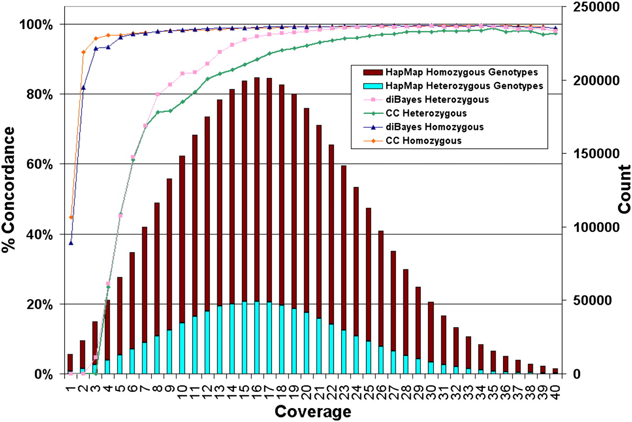 Dependence of genotype calling on depth of sequence coverage. The NA18507 genotypes called by SOLiD at all HapMap loci are compared with the HapMap genotypes by SOLiD coverage per genome position (average 18× coverage). Coverage includes alleles representing the reference or a valid base change; i.e., alleles with single or invalid adjacent mismatches are not included. No prior information about SNP presence or SNP alleles was used in making SOLiD gentoype calls. The number of HapMap loci with a given level of SOLiD coverage (“Count”) are shown and the percentage of these loci for which SOLiD gives the same genotype as HapMap for homozygotes and heterozygotes is represented by the colored lines (graphed using the left-hand y-axis and referred to as “% Concordance”) using two genotyping algorithms: Consensus Caller and diBayes. diBayes is more sensitive at heterozygous SNP detection and yields a lower false-negative rate than Consensus Caller, but we did not attempt to estimate the false-positive rate of diBayes with validation data. SOLiD genotypes that differ from HapMap gentoypes are nearly always heterozygous undercalls (i.e., the position is called homozogyous for one of the two alleles) or called as N (insufficient evidence to make a confident genotype call).