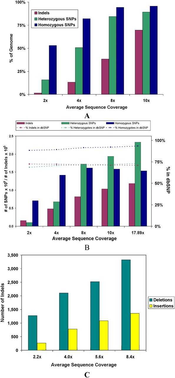 Theoretical and actual detection of SNPs and indels at various levels of average sequence coverage. (A) The upper bound on the number of SNPs and intra-read indels that can be detected at various levels of coverage. This is calculated by assessing how much of the genome meets the coverage requirements for each type of variant, 2× coverage for homozygous SNPs, 4× coverage for heterozygous SNPs, and 6× coverage without considering the 3 bp on each end of the reads for intra-read indels. For small indels, two split reads are required to make a call, but due to the more restrictive manner of these calls, only about one in three reads (as found in simulations) can be used for this. (B) The actual number of SNPs and intra-read indels detected at various levels of average sequence coverage. (C) The number of insertions and deletions ≥200 bp detected between mate-paired reads at various average levels of sequence coverage.
