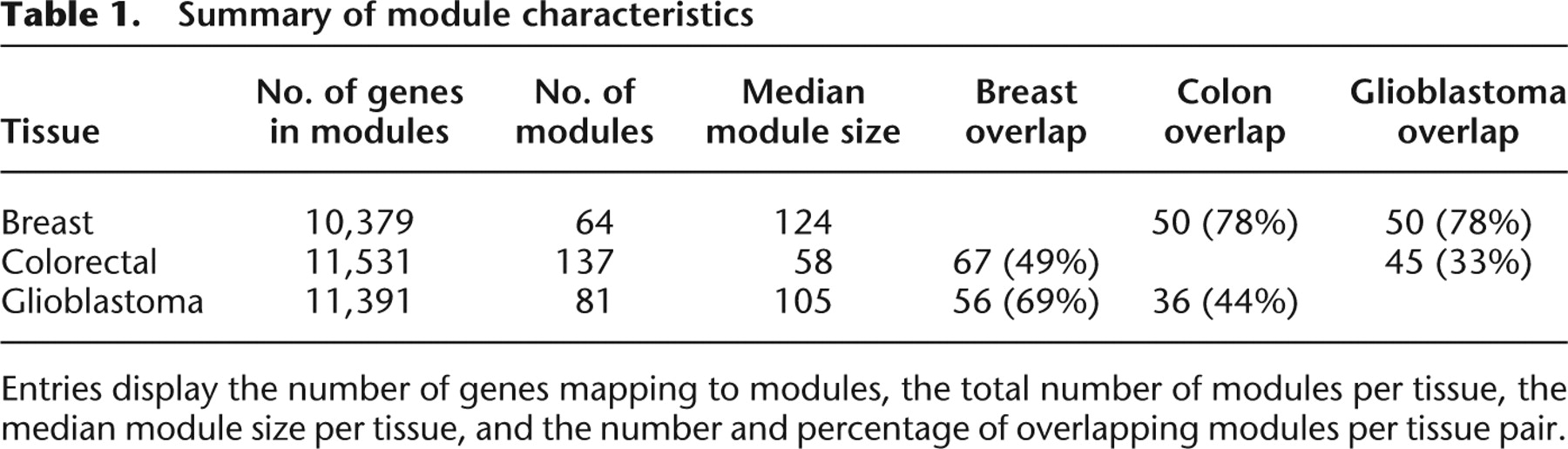 Entries display the number of genes mapping to modules, the total number of modules per tissue, the median module size per tissue, and the number and percentage of overlapping modules per tissue pair.