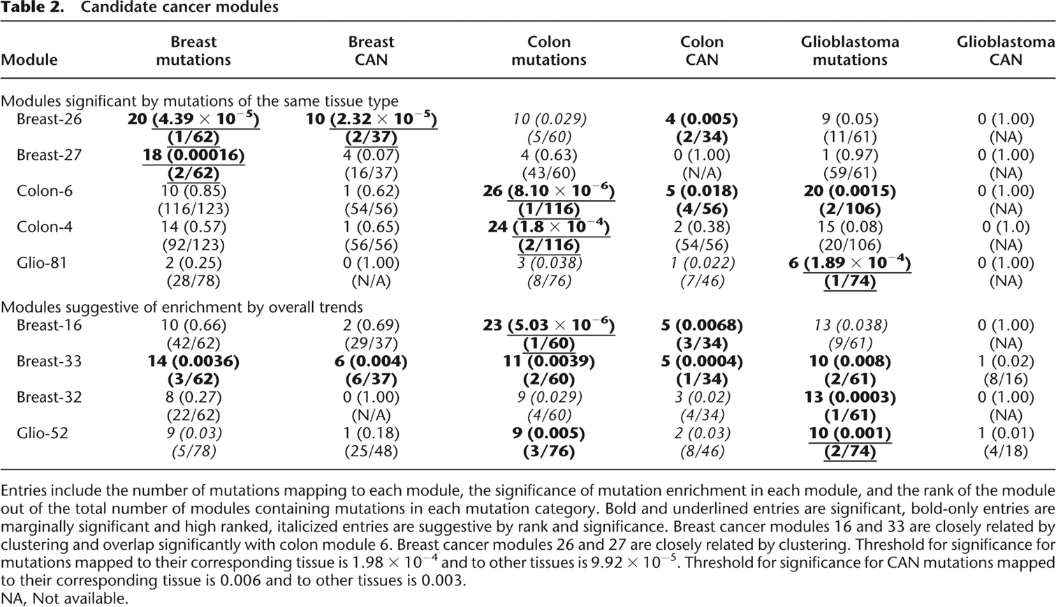 Entries include the number of mutations mapping to each module, the significance of mutation enrichment in each module, and the rank of the module out of the total number of modules containing mutations in each mutation category. Bold and underlined entries are significant, bold-only entries are marginally significant and high ranked, italicized entries are suggestive by rank and significance. Breast cancer modules 16 and 33 are closely related by clustering and overlap significantly with colon module 6. Breast cancer modules 26 and 27 are closely related by clustering. Threshold for significance for mutations mapped to their corresponding tissue is 1.98 × 10−4 and to other tissues is 9.92 × 10−5. Threshold for significance for CAN mutations mapped to their corresponding tissue is 0.006 and to other tissues is 0.003.
