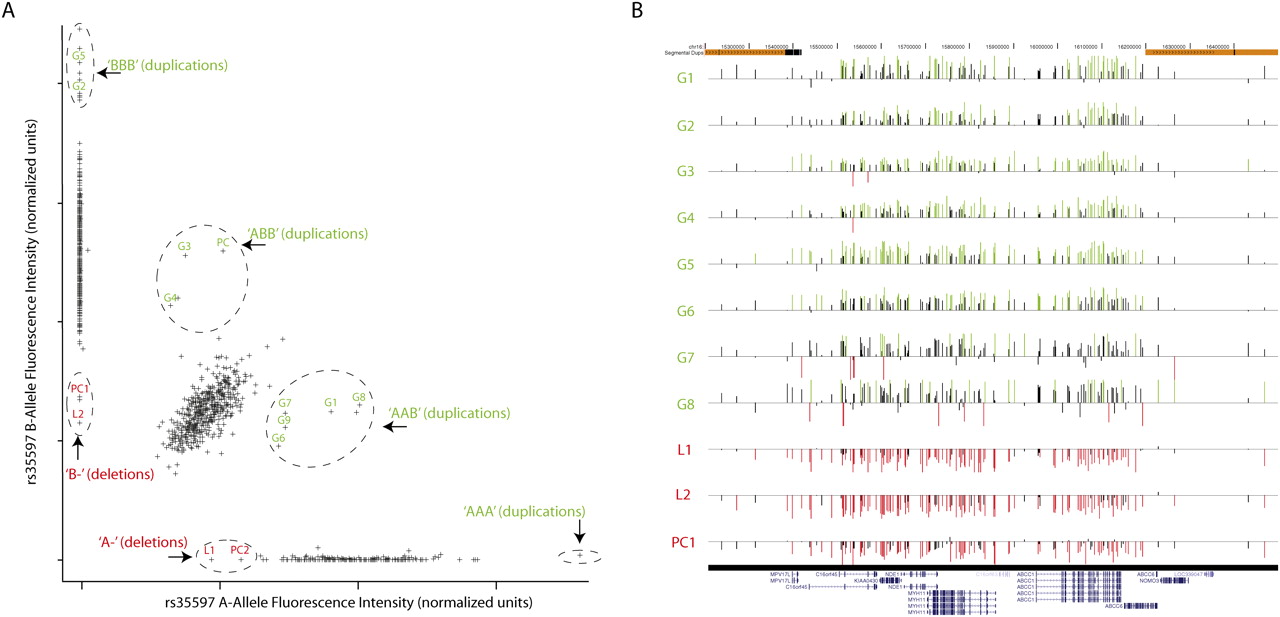 CNVs at 16p13.11 in individuals with ID. (A) SCOUT uses fluorescence intensity data generated for SNP genotypes, in this case at rs35597, to identify samples that harbor deletions or duplications. Each sample is assigned a score based on its intensity relative to the center of the cluster of all samples with the same genotype. Samples that harbor duplications exhibit greater total intensity and potentially aberrant allelic ratio (inferred genotypes marked in green), while deletions exhibit lesser intensity and lack SNP heterozygosity (inferred genotypes labeled in red). Samples analyzed as positive controls are labeled PC, while validated predictions are labeled as L1–L2 (“loss”) or G1–G9 (“gain”). Dashed circles are drawn manually for visual aid. Unlabeled samples that appear to be outliers at this probe are either outliers only at this probe or samples with insufficient DNA for validation. (B) SCOUT predictions were validated with targeted array-CGH experiments. Shown are the resulting data for the labeled samples in panel A, with normalized log-transformed test/reference ratios at each tested probe presented as vertical bars. Those probes that are more than 1.5 standard deviations above (below) the average for the entire array are colored green (red). The samples shown include eight validated duplications, two validated deletions, and one positive control deletion. Note that G9 was analyzed with a different array-CGH platform and is not shown here. Genome coordinates and segmental duplications are annotated at the top. The bottom shows RefSeq genes/isoforms annotated in this region.