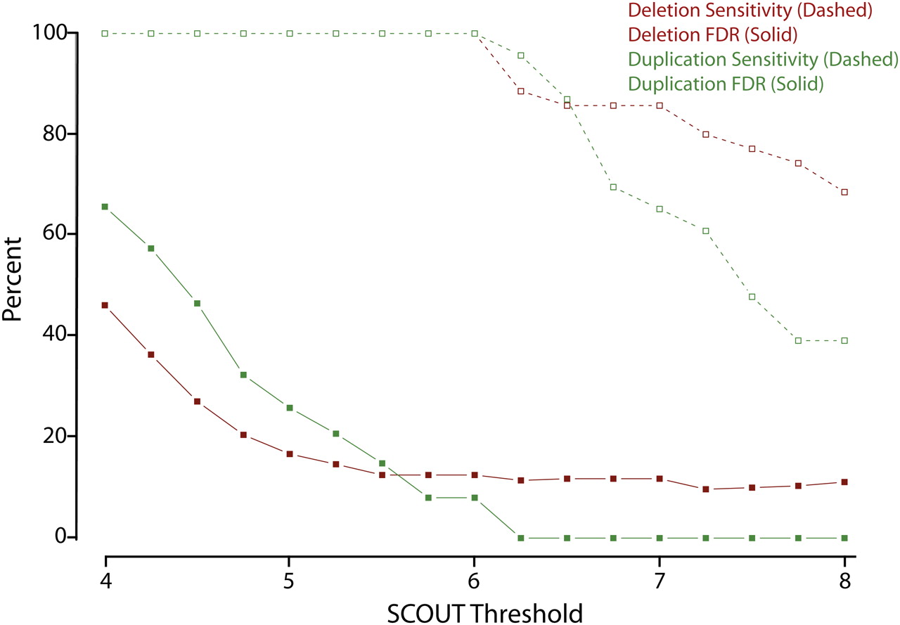 Reliability of SCOUT predictions as a function of threshold. Sensitivity (dashed lines/open squares) and false discovery rates (FDR, solid lines/solid squares) to detect deletions (red) and duplications (green) are plotted as a function of the absolute value of the SCOUT threshold, incremented by units of 0.25. These estimates exclude regions covered by only two probes and also exclude CNVs in positive control samples.