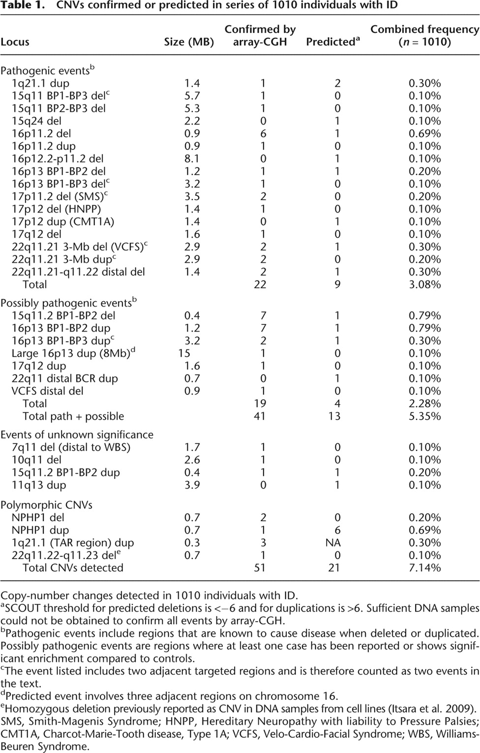 CNVs confirmed or predicted in series of 1010 individuals with ID