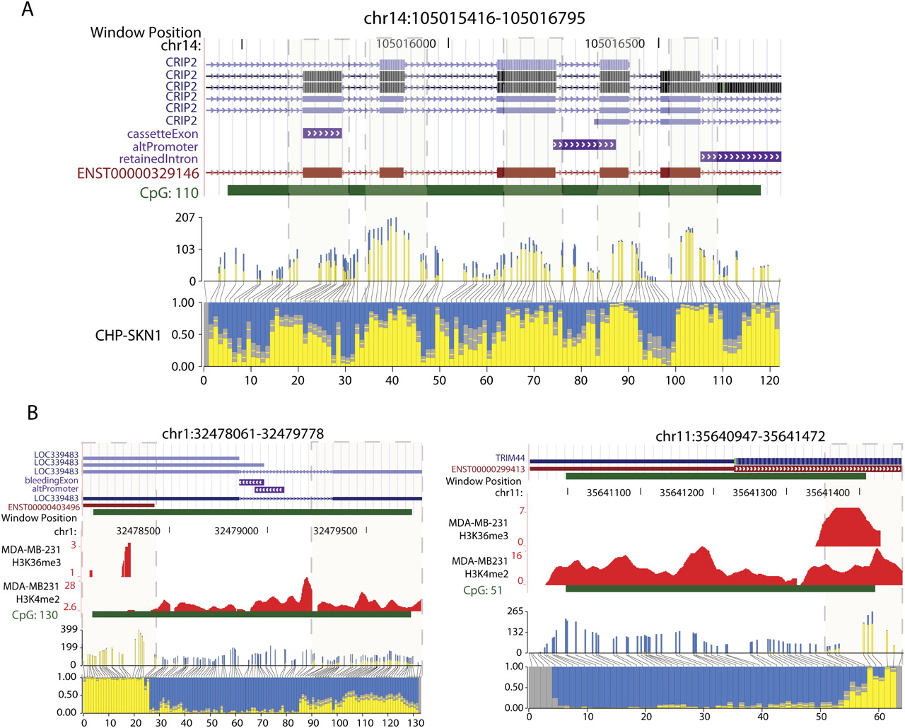 Blocks of DNA methylation overlap exons, histone H3K36me3, and histone H3K4me2 marks. (A) An example of a CGI that overlaps multiple exons. Annotated gene tracks were downloaded from the UCSC Genome Browser. The gene tracks are displayed above a histogram plotting methylation frequencies at specific CpG sites positioned along the region shown. Absolute read counts and actual distance between CpG sites are depicted in the upper histogram, whereas the lower histogram shows the proportion of methylated and unmethylated Cs at each site. Boxes with dashed borders highlight blocks of methylation overlapping exons. The edges of the block are defined by the point at which the proportion of reads methylated is at least 0.5. (B) Two examples for which the distribution of histone marks along the CGI reflects DNA methylation status. To display the ChIP-seq data, a wiggle track was created for each histone mark by counting reads mapped in five-base windows across the genome.