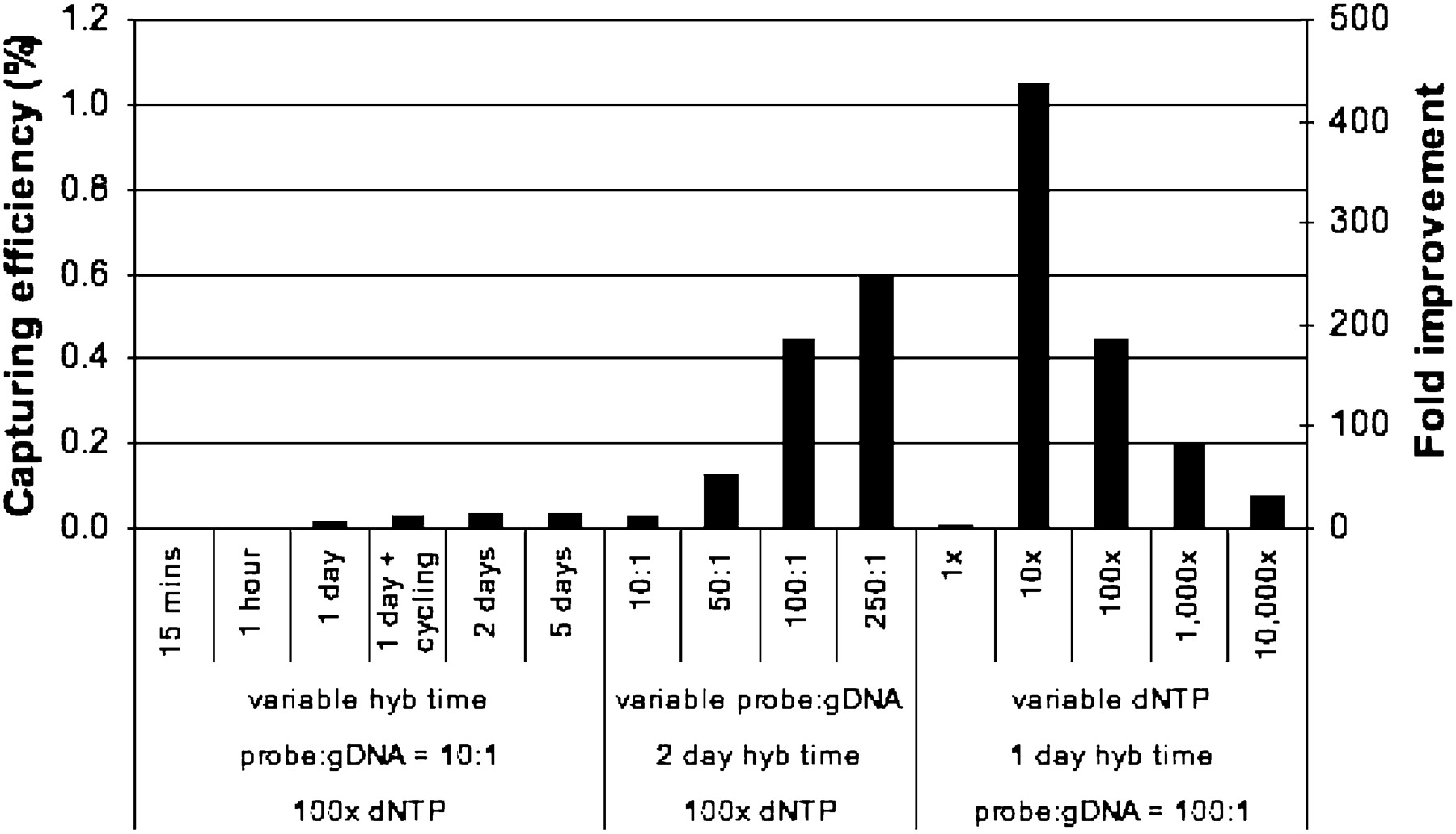 Improvement of padlock capturing efficiency with longer hybridization time (left), more probes (middle), and appropriate dNTP concentration (right). The ratios (10:1, 50:1, 100:1, and 250:1) are molar ratios between each of the padlock probes and genomes. dNTP (1×) is defined as the minimum amount of dNTP needed to capture all genomic copies at each target region. The fold improvement (vertical axis at right) is relative to the reaction with 10:1 probe ratio, hybridized for 15 min at 60°C, and with 100× dNTP. Similar results were observed in independent experiments.