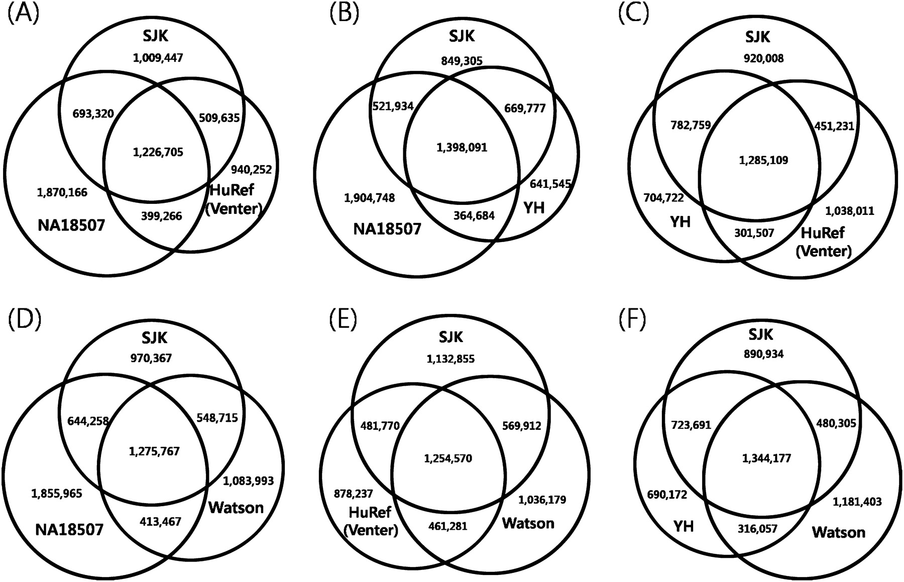 Comparisons of SNPs among (A) SJK, NA18507 (Yoruba), and HuRef (Venter's); (B) SJK, NA18507, and YH (Chinese); (C) SJK, YH, and HuRef; (D) SJK, NA18507, and Watson; (E) SJK, HuRef, and Watson; and (F) SJK, YH, and Watson.