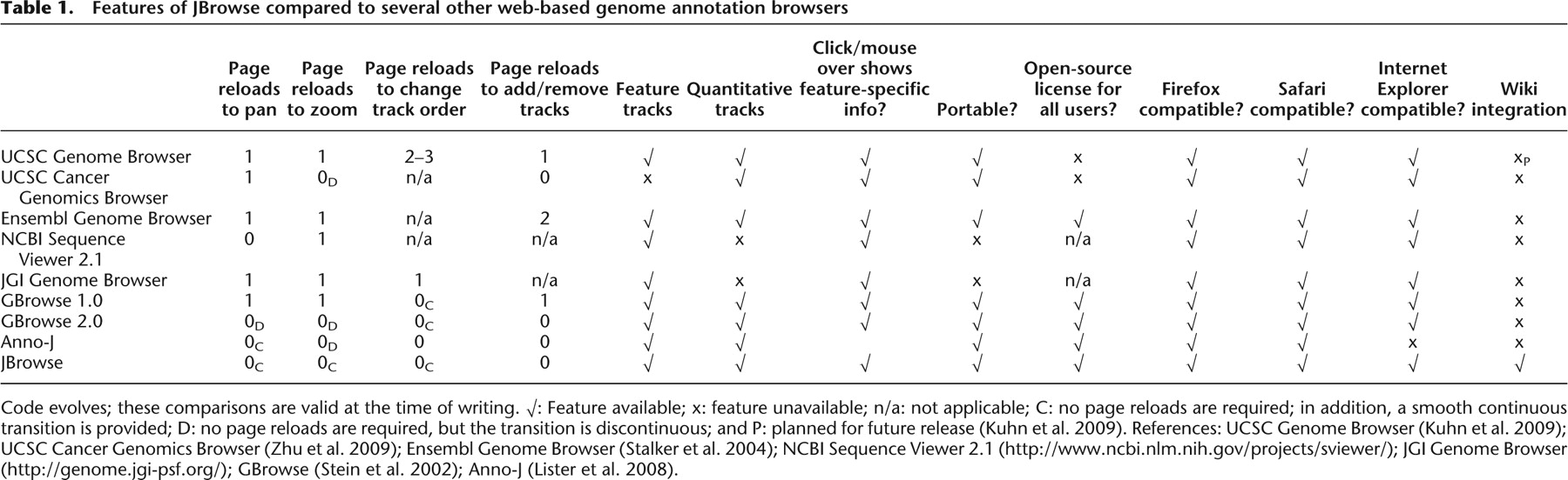 Code evolves; these comparisons are valid at the time of writing. √: Feature available; x: feature unavailable; n/a: not applicable; C: no page reloads are required; in addition, a smooth continuous transition is provided; D: no page reloads are required, but the transition is discontinuous; and P: planned for future release (Kuhn et al. 2009). References: UCSC Genome Browser (Kuhn et al. 2009); UCSC Cancer Genomics Browser (Zhu et al. 2009); Ensembl Genome Browser (Stalker et al. 2004); NCBI Sequence Viewer 2.1 (http://www.ncbi.nlm.nih.gov/projects/sviewer/); JGI Genome Browser (http://genome.jgi-psf.org/); GBrowse (Stein et al. 2002); Anno-J (Lister et al. 2008).