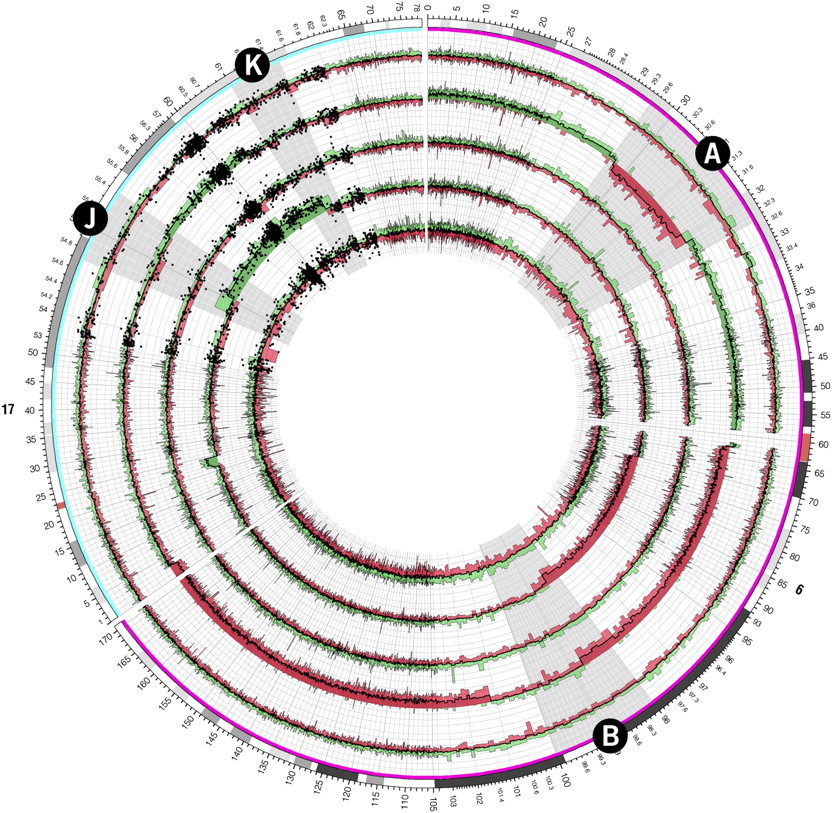 Copy number profiles for chromosomes 6 and 17 of five follicular lymphoma tumor samples generated from the Affymetrix Mapping 500K array. Regions of interest A and B on chromosomes 6 and J and K on chromosomes 17 (corresponding to similarly labeled zoomed ideograms in Fig. 6) are magnified by a continuous scale expansion in these regions. Individual probe values are shown as a scatterplot in the vicinity of regions J and K.