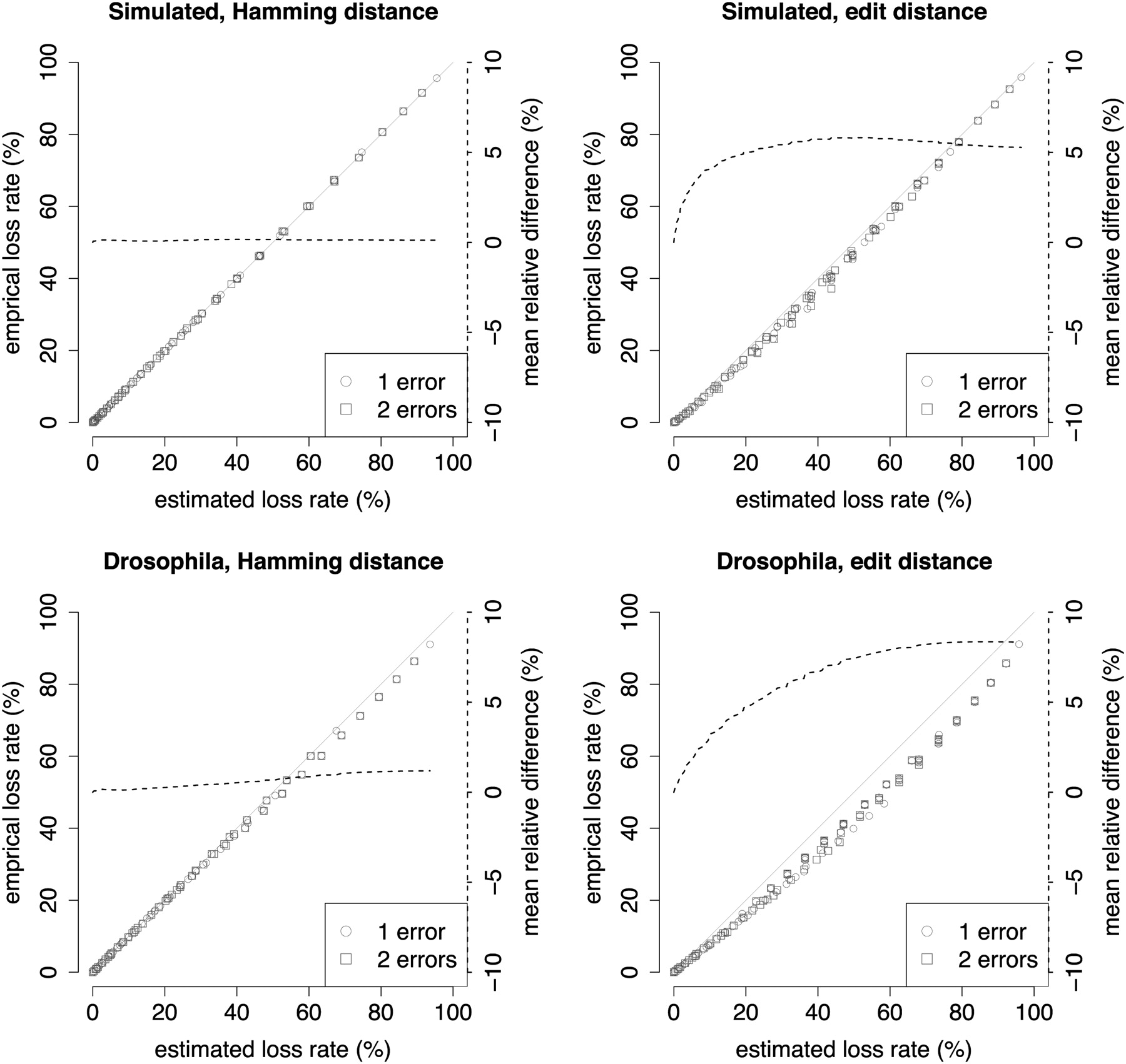 Comparison of estimated and empirical loss rates (loss rate = 1 − sensitivity) varying weight q = 8,…, 14 and threshold t = 1,…, 20. The dashed line reflects the mean of relative differences, 1 − (empirical loss rate/estimated loss rate), of all estimated loss rates below a varying level.