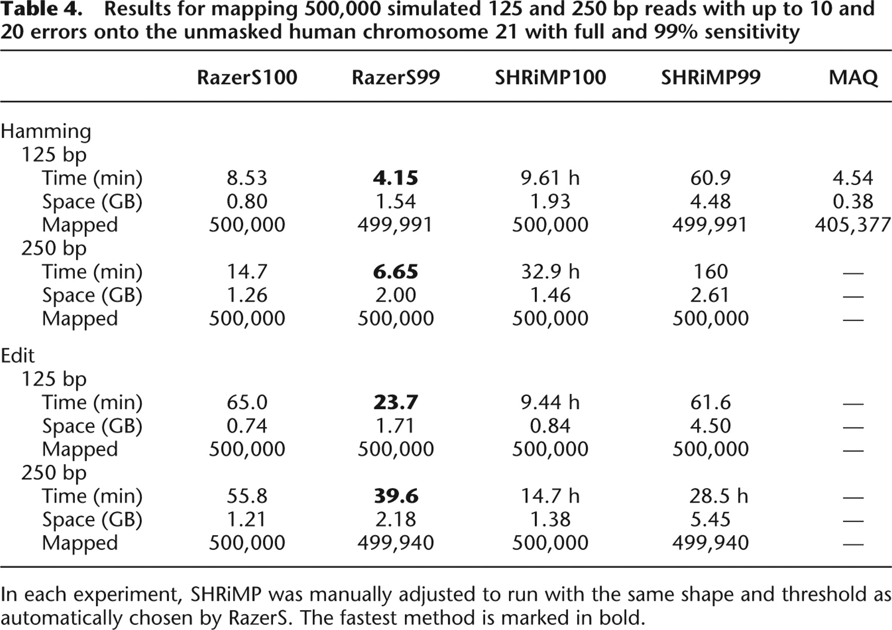 Results for mapping 500,000 simulated 125 and 250 bp reads with up to 10 and 20 errors onto the unmasked human chromosome 21 with full and 99% sensitivity