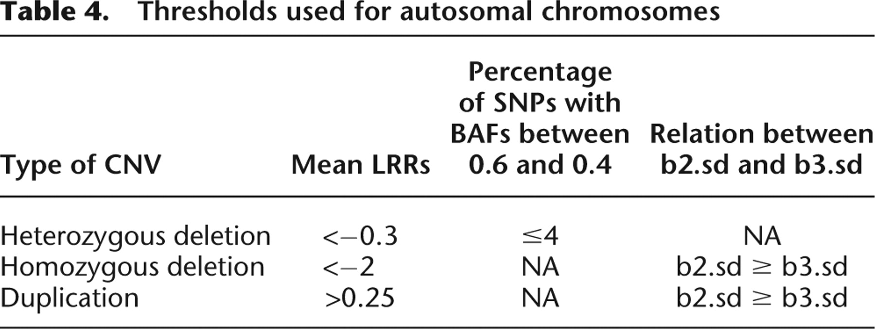 Thresholds used for autosomal chromosomes