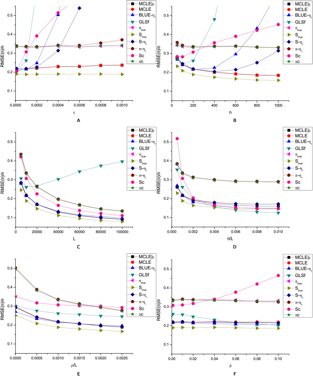 Effects of ɛ (A), n (B), L (C), θ/L (D), ρ/L (E), and δ (F) on the root mean squared error of different θ estimators. MCLE|ɛ: MCLE(θ) assuming known ɛ; MCLE: MCLE(θ) assuming unknown ɛ; BLUE-η1: