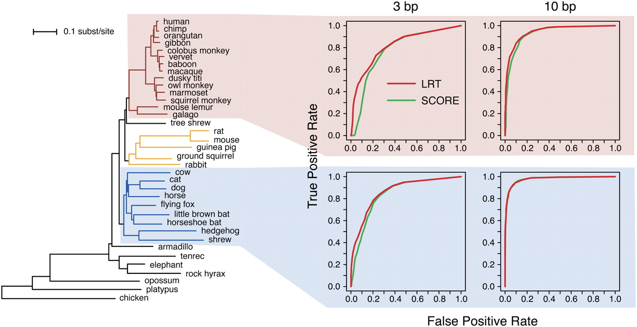 Subtree ROC curves. (Left) Phylogenetic tree used in this study, with branch lengths drawn in proportion to the values estimated from 4D sites. Three subtrees are highlighted: (maroon) primates, (gold) glires, and (blue) laurasiatherians. (Right) ROC curves for the LRT (red) and SCORE (green) subtree tests as applied to 3-bp and 10-bp elements under clade-specific selection in the primates (top) and laurasiatherians (bottom). (The SPH method did not perform as well, and the subtree test is not supported with the GERP method.) Results are shown for the case in which ρ = 1.0 and λ = 0.3, meaning that the clade of interest is evolving at approximately one-third the neutral rate, while the rest of the tree is neutrally evolving.