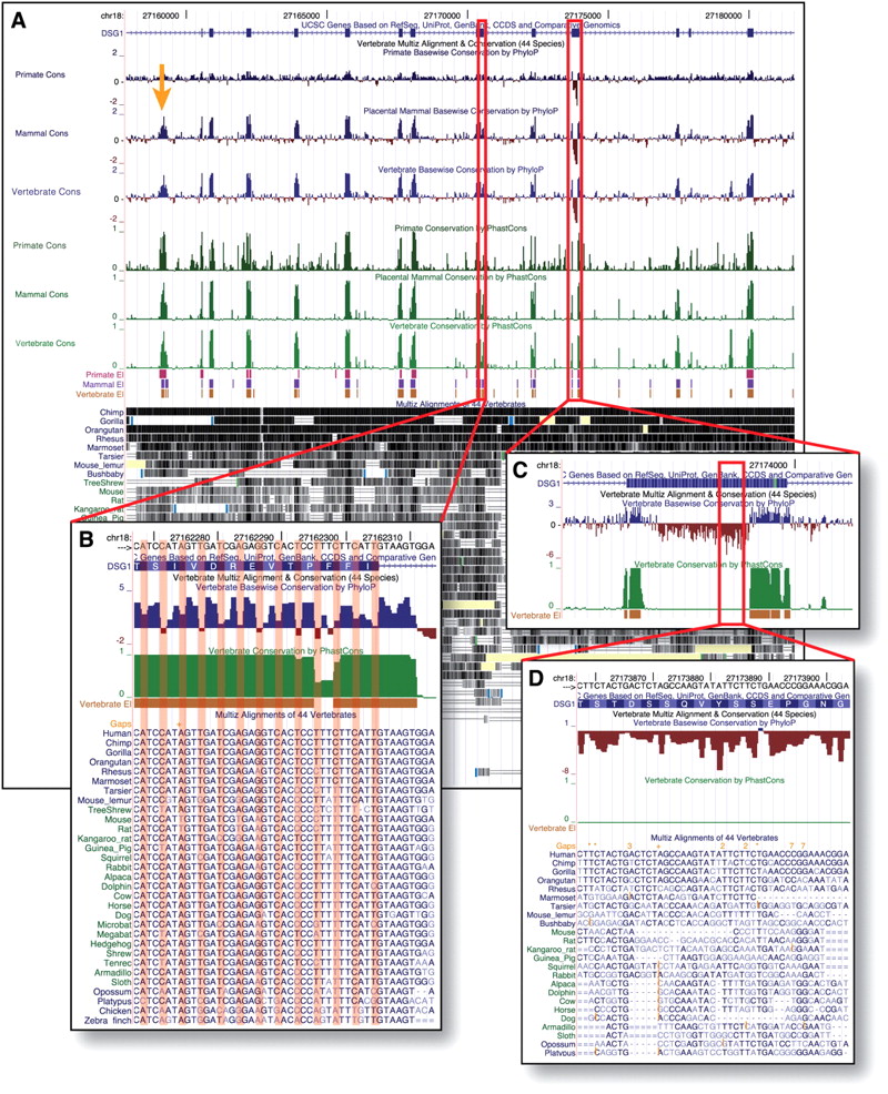 Conservation track in UCSC Genome Browser. A portion of the desmoglein 1 (DSG1) gene on human chromosome 18 shown with the new Conservation track, including a 44-way vertebrate alignment and nine conservation subtracks. The subtracks display phyloP scores (in blue and red), phastCons scores (green), and phastCons-predicted conserved elements (pink, purple, and mustard) for all species, the 32 placental mammals, and the nine primates (bottom to top within each group). (A) The phyloP and phastCons scores are broadly similar when the display is zoomed out, with scores near zero for most noncoding regions but elevated in exons (thick blue bars at top) as well as in conserved noncoding elements (orange arrow). (B) At finer resolution, however, phyloP reveals significantly more variation from base to base than does the hidden Markov model–based phastCons. In this coding exon, codon position effects are clearly evident from phyloP but not from phastCons. (C,D) The phyloP tracks also indicate accelerated evolution (with negative scores, shown in red), while phastCons measures conservation only. Here an exon with a striking fast-evolving segment is shown. Interestingly, cDNA data from other mammals suggest that this exon derives from a fusion of two ancestral exons, with the fast-evolving segment corresponding to the ancestral intron.