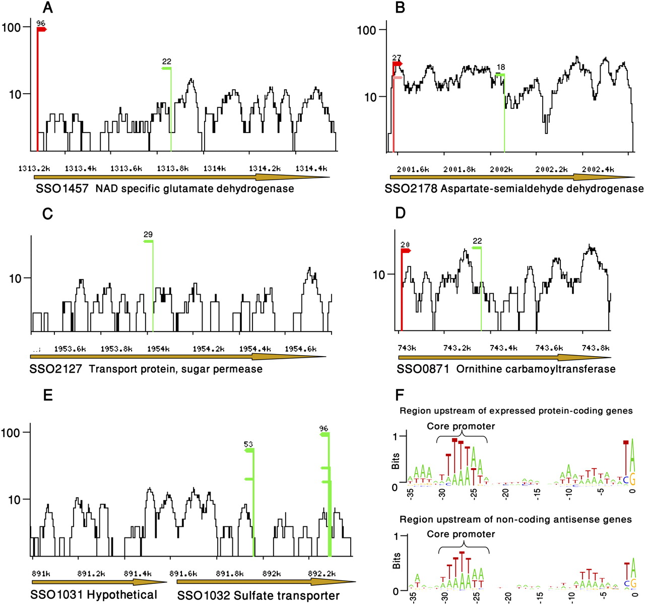 Cis-antisense transcription in S. solfataricus. Green TSS positions represent transcripts encoded from the strand opposite to the protein-coding gene. Read coverage is in log scale. (A) Antisense transcription in the SSO1457 locus, encoding NAD-specific glutamate dehydrognase. (B) Antisense transcription in the SSO2178 locus, encoding aspartate semialdehyde dehydrognase. (C) Antisense transcription in the SSO2127 locus, encoding a sugar permease (sense transcription not observed). (D) Antisense transcription in the SSO0871 locus, encoding ornithine carbamoyltransferase. (E) Antisense transcription in the SSO1032 locus, encoding a sulfate ABC transporter (sense transcription not observed). (F) Antisense transcripts have promoters embedded within the protein-coding genes they overlap. Sequence motifs upstream of protein-coding genes (upper panel) compared to motifs upstream of noncoding antisense transcripts (lower panel). Positions relative to TSS are marked below the sequences. The height of each letter corresponds to its frequency at that position. The core promoter motif in Archaea is indicated. The plot was prepared using the WebLogo software tool (Crooks et al. 2004).