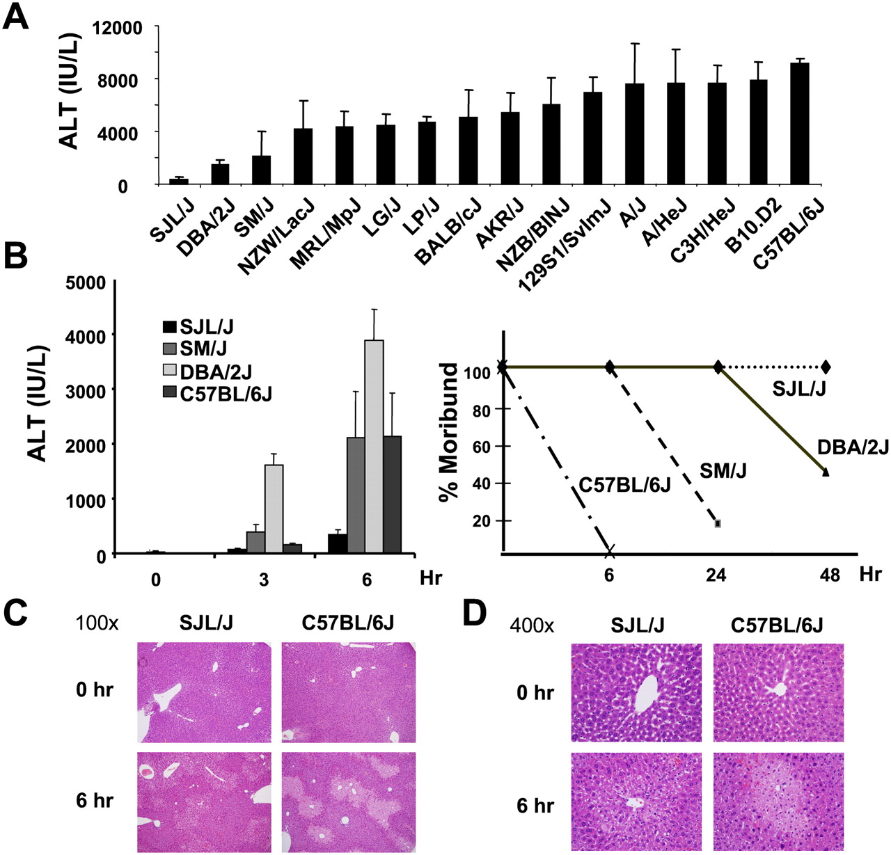 Acetaminophen (APAP)-induced hepatotoxicity in inbred mouse strains. (A) Serum alanine aminotransferase (ALT) activity was measured 6 h after 16 inbred mouse strains were treated with 300 i.p. mg/kg APAP. The bars represent the average ± SD for N = 5 mice per group. SJL/J mice were resistant to APAP-induced toxicity, while all other strains developed significant toxicity. (B) Serum ALT (left) and the percentage of moribund mice (right) were measured at the indicated times after APAP treatment in four inbred strains. Veterinarians that were blinded to whether the mice received drug or placebo determined when mice were moribund. The ALT measurements are the average ± SE (N = 7 mice per group); and the percentage of moribund mice was determined from analyses of 10 mice. (C,D) Hematoxylin and eosin staining of liver tissue from SJL/J and C57BL/6J mice at 0 and 6 h after APAP treatment are shown at 100× and 400× magnifications, respectively.