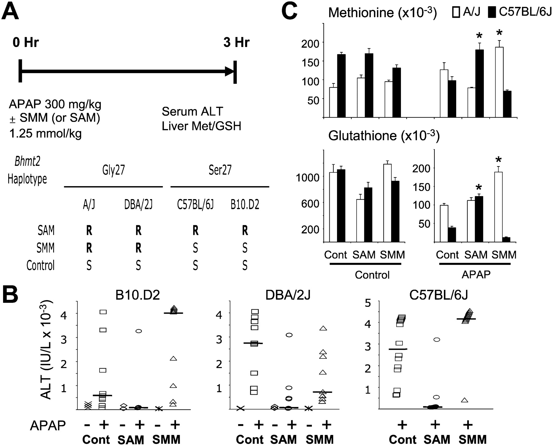 (A) Diagram of an experiment assessing the strain-specific effect of SMM or SAM coadministration on APAP-induced liver toxicity. Hepatic glutathione (GSH) and methionine levels and the serum ALT were measured 3 h after APAP administration to inbred strains. If BHMT2 activity affected sensitivity to APAP-induced liver injury, coadministration of a BHMT2-specific substrate (SMM) should have a protective effect in strains with active BHMT2 enzyme (Gly 27 allele), but not in strains with inactive (Ser 27 allele) enzyme. In contrast, SAM, which affects GSH biosynthesis at a step distal to BHMT2, should have a protective effect in all strains. Based upon the Bhmt2 allele, the R and S in the lower panel indicate whether SMM coadministration should have a protective (rescue, R) effect, or not have a beneficial (susceptible, S) effect on APAP-induced liver toxicity, respectively. (B) The serum ALT level was measured 3 h after treatment with vehicle, SAM, or SMM plus either vehicle or APAP. Nine or more mice were in each APAP-treated group. The horizontal line indicates the median value for each group, and P-values assessing whether SAM or SMM coadministration decreased the serum ALT levels relative to control were calculated. For DBA/2J mice, the P-values for the effect of SAM and SMM coadministration were 0.00058 and 0.0087, respectively. The effect of SAM and SMM coadministration in B10.D2 mice had P-values of 0.00029 and 0.9735, respectively. C57BL/6J mice had similar P-values (0.0000002 for SAM; 0.9985 for SMM). (C) C57BL/6J or A/J mice were treated with vehicle, SAM, or SMM plus either vehicle or APAP. Liver samples were obtained 3 h after dosing and the amount of GSH and methionine were determined by LC/MS/MS analysis. The data represent the average ± SE for N = three samples. An asterisk (*) indicates a P-value < 0.001 relative to the control-APAP treated mice by Student's t-test.