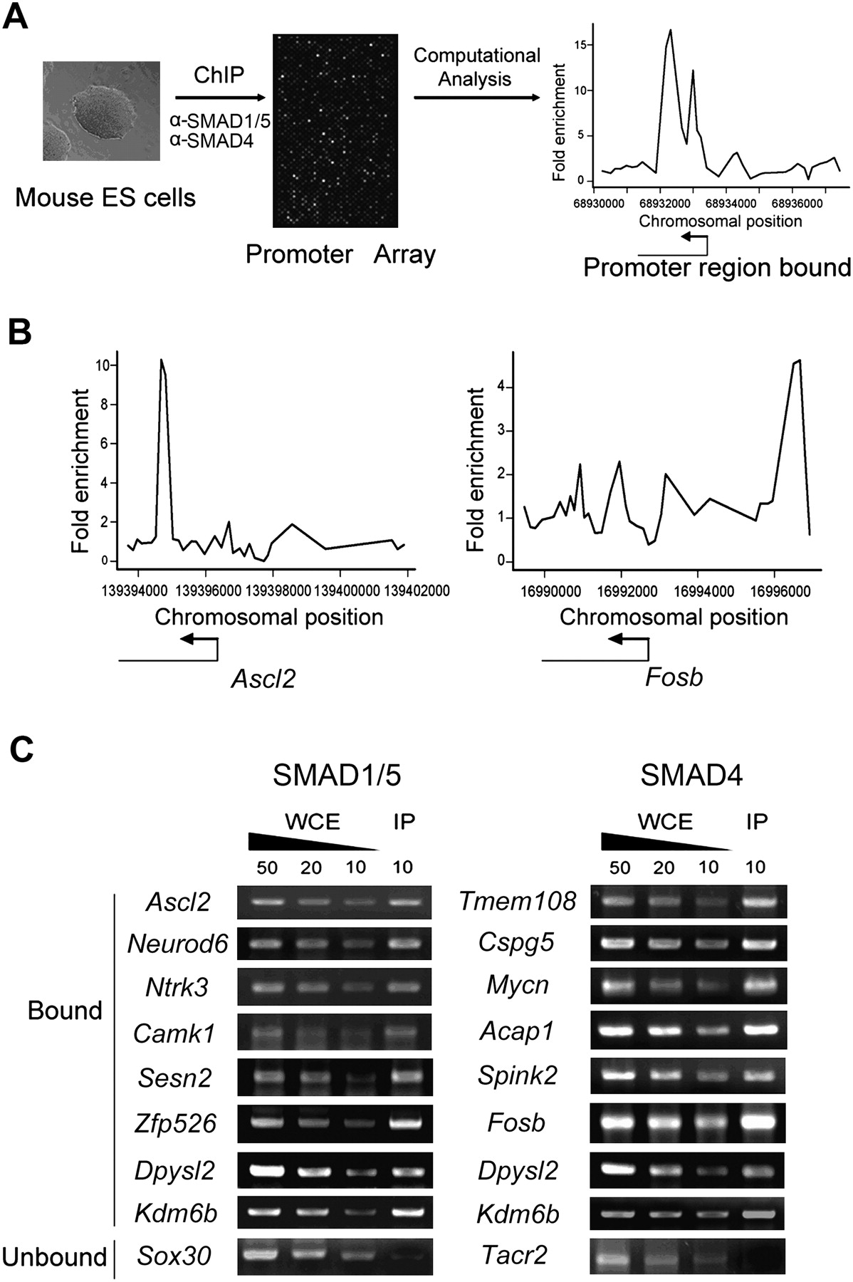 Genome-wide analysis of SMAD1/5- and SMAD4-binding sites in R1 ES cells. (A) Strategy of mapping SMAD1/5- and SMAD4-binding sites in the genome of R1 cells. (B) A representative view of SMAD-bound regions. Plots display ChIP-enriched ratios or the signal intensity ratio of the immunoprecipitated DNA (IP)/whole cell extract (WCE) DNA within the chromosomal region indicated by the x-axis. The corresponding gene is depicted below the plot, and the transcriptional start sites (TSS) and transcriptional directions are denoted by arrows. (C) Representative results of confirmation of SMAD binding to DNA by ChIP-site specific PCR. Immuno-enriched (anti-SMAD IP) DNA (10 ng) from R1 cells and a range of unenriched WCE DNA amounts (10, 20, 50 ng of DNA) are used for each primer pair which is designed according to the predicted bound regions.