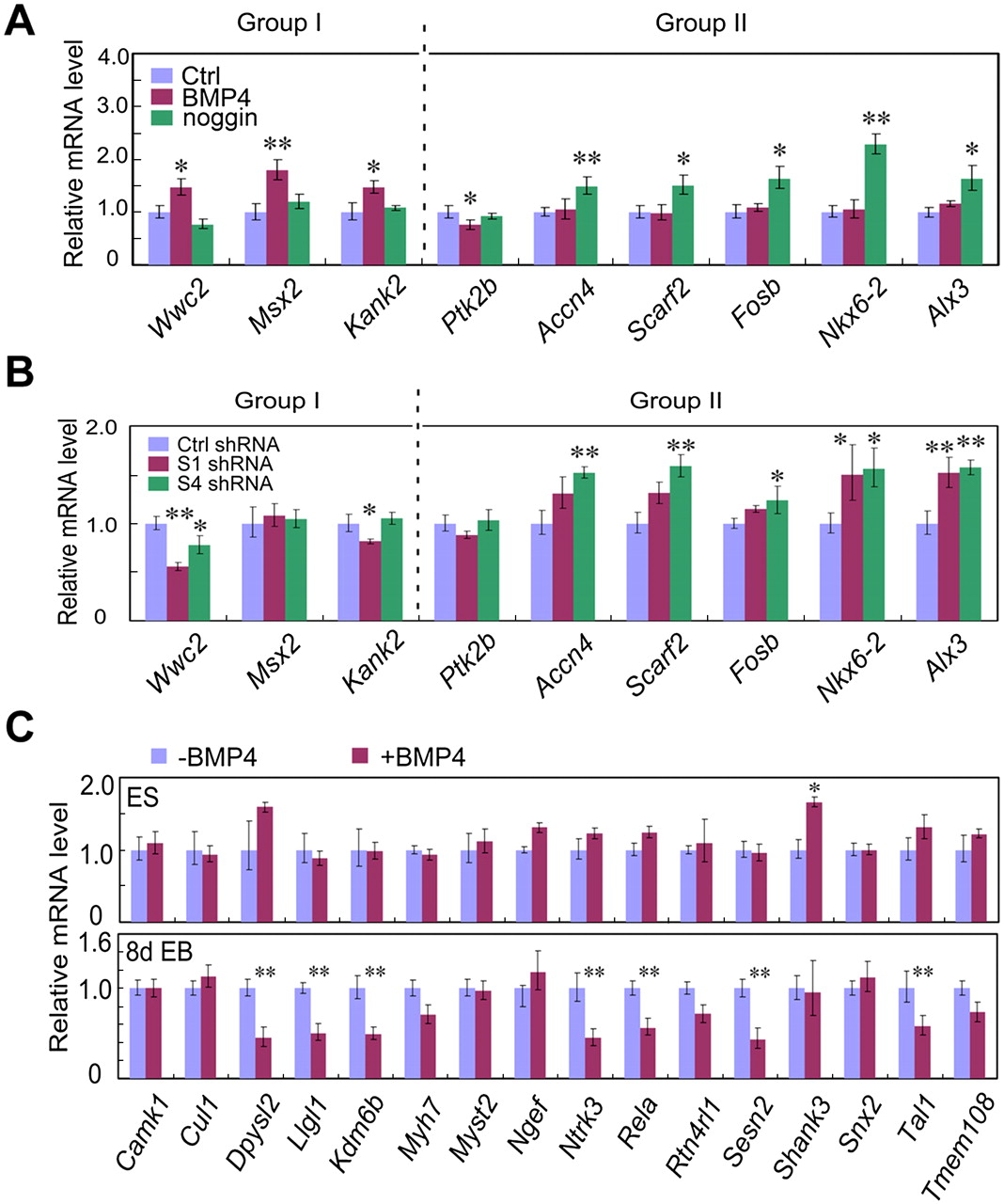 Expression analysis of SMAD-associated genes. (A) Validation of genes expression change upon ligand stimulation. Group I includes genes that are up-regulated in BMP4 and/or down-regulated in noggin according to microarray analysis and genes in Group II are oppositely regulated. (B) Gene expression in Smad1 and Smad4 knockdown ES cells. (C) SMAD-associated genes are regulated in ES cells and EB upon BMP4 treatment. ES cells and 8-d EB were treated with 20 ng/mL BMP4 for 4 h. Total RNA was extracted and gene expression was analyzed by qRT-PCR. The significance of expression was analyzed by Student's t-test and data are presented as mean ± SEM (n = 3; **P < 0.01; *P < 0.05).