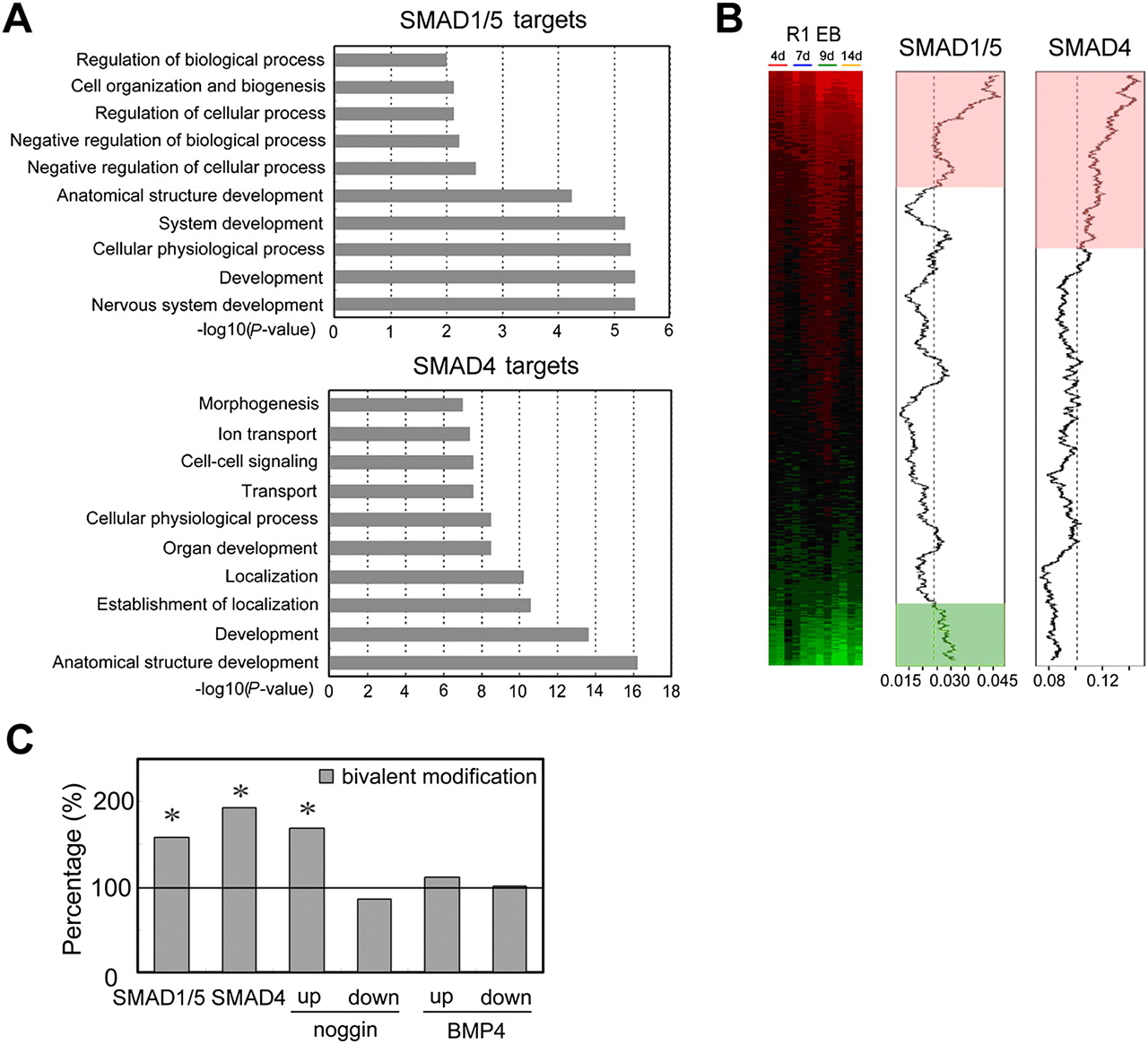Developmental regulators are enriched in the SMAD-associated genes. (A) GO analysis of SMAD-associated genes. The y-axis shows the GO terms, and the x-axis shows the enrichment significance P-values for the top 10 enriched GO terms. (B) Genome-wide analysis of SMAD1/5 and SMAD4 targets during EB differentiation. The expression profile data are from Hailesellasse Sene et al. (2007). Genes are rank-ordered by the degree of induction (red) and repression (green) relative to undifferentiated ES cells (left). The two plots (middle and right) show moving average of the frequency of probes for genes that have SMAD-binding sites in a 2000-probe sliding window. The pink and light-green shaded areas indicate the genes whose SMAD-binding frequency is higher than the background level. The dashed line indicates the expected average (background level or the ratio of the number of probes for SMAD targets over the total number of interrogated gene probes). (C) Percentage of SMAD-bound genes, BMP4- and noggin-regulated genes that contain both H3K4me3 and H3K27me3 bivalent modifications were compared to that over all promoters. Asterisk indicates Fisher's exact test P < 0.001. Proportion test also showed similar results (data not shown).