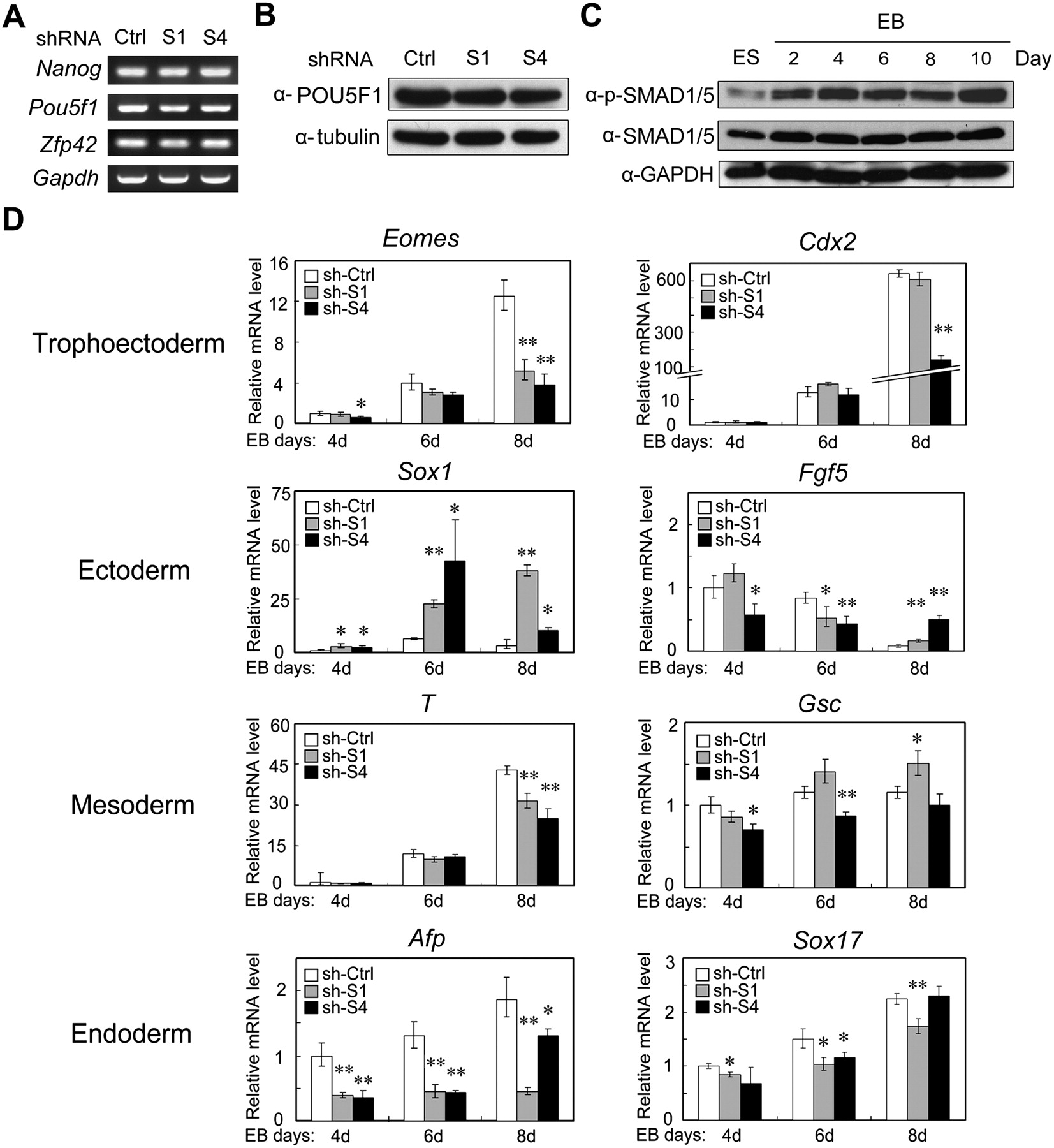 SMAD1 and SMAD4 are largely involved in differentiation regulation rather than direct self-renewal maintenance. (A) Knockdown of Smad1 or Smad4 has no effect on the expression of self-renewal markers. Total RNA extracted from R1 cells expressing Smad shRNA or control shRNA constructs were subjected to RT-PCR. Gapdh served as a loading control. (B) No difference of the POU5F1 protein levels in R1 cells expressing Smad shRNA or control shRNA. Protein expression was examined by immunoblotting. Tubulin served as a loading control. (C) Phosphorylation of SMAD1/5 is enhanced during EB formation. EB was formed in serum-free KO-SR culture conditions, and total proteins were collected at indicated times and subjected for anti-phopho-SMAD1/5 and anti-SMAD1/5 immunoblotting. GAPDH served as a loading control. (D) Smad knockdown alters the expression profile of germ layer markers. Quantitative RT-PCR analysis was performed to examine marker expression in Smad shRNA and control shRNA cells during the course of EB differentiation. The significance of expression was analyzed by Student's t-test, and data are presented as mean ± SEM (n = 3; **P < 0.01; *P < 0.05). This experiment was repeated three times and similar results were obtained.