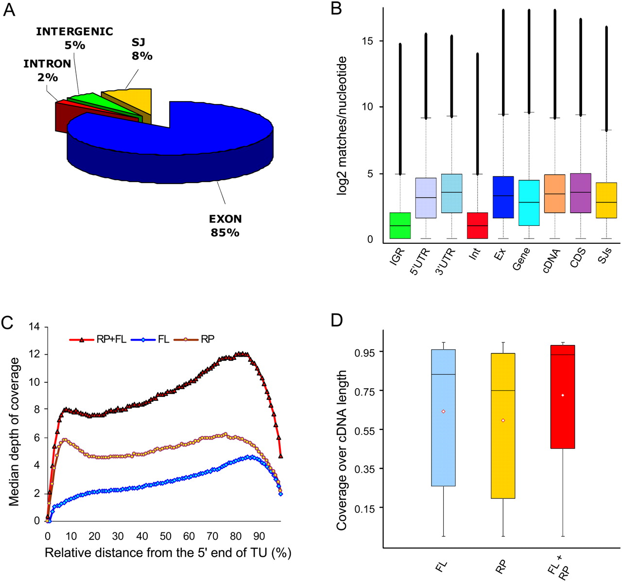 Depth and coverage of annotated gene features. (A) Distribution of the RNA-seq microreads along annotated Arabidopsis annotated genomic features. Among reads perfectly matching the Arabidopsis genome, there were 71.3 million matches to annotated exons, 6.7 million matches to annotated splice junctions, 4.4 million matches to annotated intergenic regions, and 1.4 million matches to annotated introns. Of the remaining 187 million reads, ∼20% matched the Arabidopsis genome allowing for up to two mismatches and the remaining ∼50% aligned with more than two mismatches or did not match at all. (B) Box-and-whisker plots of log2-transformed numbers of microread matches at each nucleotide position for TAIR annotated intergenic regions (IGR), 5′ untranslated regions (5′UTR), 3′ untranslated regions (3′UTR), introns (Int), exons (Ex), genes (Gene), cDNAs (cDNA), coding sequences (CDS), and splice junctions (SJs). The bottom and top of the box represent the 25th and 75th quartiles, respectively, and the middle line is the median. Black filled circles show outliers. (C) Distribution of the RNA-seq microread coverage along the length of the transcriptional unit. The median depth of coverage along the length of each individual cDNA was calculated as described in the Supplemental Material and plotted against the relative length of the transcriptional unit (cDNA) for full-length enriched oligo(dT)-primed libraries (blue diamonds) and randomly primed libraries (yellow circles). The combined data from the two libraries are depicted by red triangles. (D) Coverage over the length of TAIR8 annotated cDNAs. Perfect match 32-mer Illumina reads were mapped to the TAIR8 annotated cDNAs for nuclear genes using HashMatch (http://mocklerlab-tools.cgrb.oregonstate.edu/). Illumina read coverage along the predicted sequence features was calculated using a Perl script. Box-and-whisker plots depict the Illumina coverage calculated as the percentage of bases along the length of the cDNA sequence that was supported by Illumina reads from the FL, RP, and combined FL + RP data sets. The bottom and top of the box represent the 25th and 75th quartiles, respectively. The black line is the median and the red diamonds are the mean.