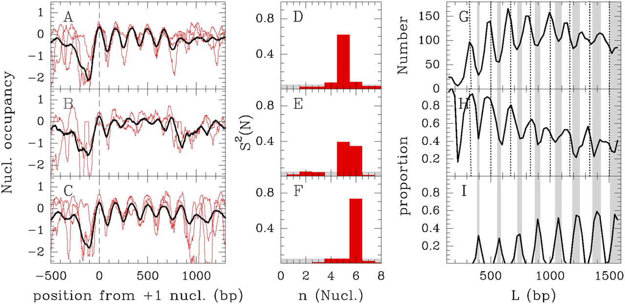 Average experimental nucleosome occupancy profiles of crystal-like and bi-stable genes (black), together with some examples of individual gene profiles (red): (A) crystal genes with n = 5 nucleosomes; (B) bi-stable genes at the transition between the n = 5 and n = 6 crystal gene domains; (C) crystal genes with n = 6 nucleosomes. Power spectrum (PS) (see Methods) of nucleosome occupancy profiles: (D) PS of one crystal gene profile with a dominant peak at n = 5 nucleosomes; (E) PS of one bi-stable gene with two main peaks of comparable magnitude at n = 5 and 6 nucleosomes; (F) PS of one crystal gene profile with a dominant peak at n = 6 nucleosomes. Total number of genes (G), proportion (density) of crystal genes (H), and proportion (density) of bi-stable genes (I) as a function of the gene size L (see Methods); the plotted data correspond to average values computed in a 50 bp sliding window. In G–I, the vertical gray bands define bi-stability domains and the vertical dotted lines indicate the successive L = n × 167, with n = 2,3,…