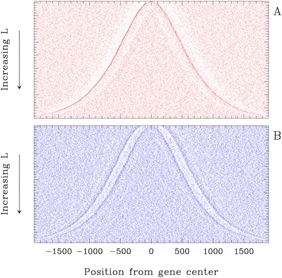 2D map of nucleosome occupancy along yeast genes (same coding as in Fig. 1A). (A) In vitro data retrieved from Kaplan et al. (2009). (B) Theoretical nucleosome energy gain [−E(s)] landscape predicted by the model II (Vaillant et al. 2007).