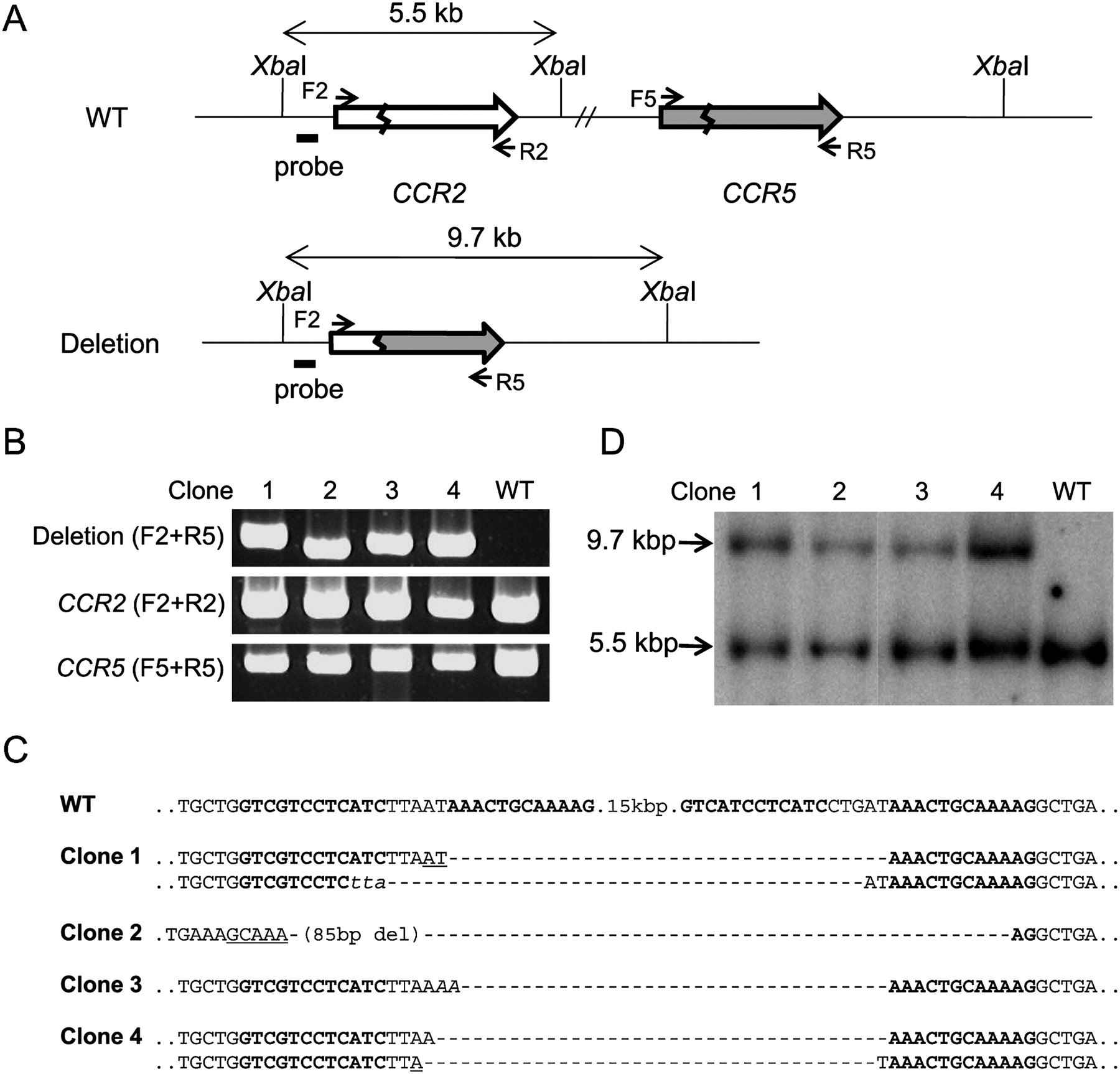 Analyses of clonal populations of cells whose genomic segments were deleted by ZFNs. (A) Schematic of CCR2 and CCR5 loci in wild-type cells and in clonal cells whose genomic segments were deleted. The probe (black bar) and the restriction enzyme, XbaI, used for Southern blot analysis are indicated. F2, R2, F5, and R5 are PCR primers (arrows) used for the detection of genome deletion events or the intact CCR2 and CCR5 loci. (B) PCR products validating genomic deletions and the intact CCR2 and CCR5 region. PCR primers are shown in parentheses. Clones 1 to 4 are clonal cells isolated by limiting dilution. (WT) Wild-type cells. (C) DNA sequences of deletion junctions in clonal cells. Symbols are as in Figure 1. (D) Southern blot analysis of clonal cells.