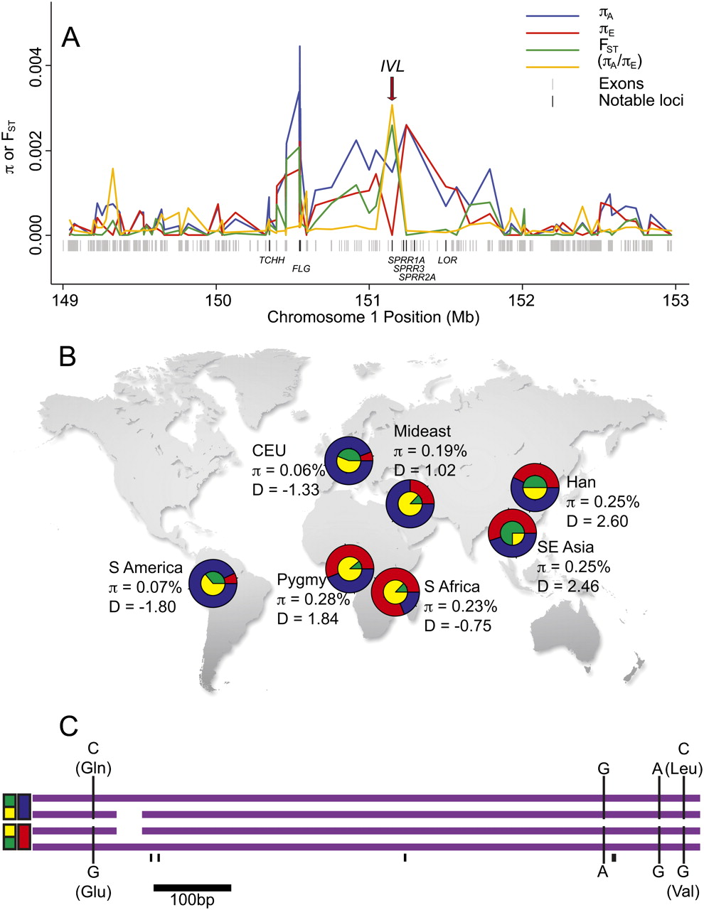 Population genetic patterns at the IVL locus. (A) Sliding window analysis of exome polymorphism and divergence in the EDC. While high π is common throughout the EDC, IVL shows very high FST, low πE, and high πA. The ratio of πA to πE has been scaled by dividing by 10,000. The positions of all exons and several notable genes that interact with IVL (Supplemental Fig. 3) are indicated. (B) Global IVL allele frequencies for SNP-based divergent haplotypes (red vs. blue) and a length polymorphism (green vs. yellow). We sequenced and analyzed a portion of IVL in seven populations: CEU (n = number of chromosomes = 34), S Africa (n = 16), Han (n = 30), Pygmy (n = 18), Mideast (n = 16), SE Asia (n = 20), and S America (n = 14). The glutamic acid carrying haplotype (red) was highest in Africa, while the glutamine carrying haplotype (blue) was highest in Europe. Tajima's D and π values varied remarkably among populations. Population differences for the green/yellow length polymorphism were less striking but still substantial between Africa/Mideast and elsewhere. (C) The four most common alleles in the 828–858-bp portion of IVL that we sequenced are shown. Four SNPs, two synonymous and two nonsynonymous, in perfect linkage disequilibrium defined two haplotypes (red and blue). An extra copy of a 30-bp repetitive sequence was present (green) or absent (yellow) on some copies of both haplotypes. All additional polymorphisms, indicated by short unmarked black lines, were rare and endemic to Africa.