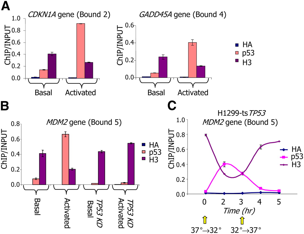 Nucleosome depletion from p53-bound sites is transient and rapidly reversible. (A) ChIP was performed with antibodies against p53, histone H3, or HA epitope tag (HA) as control, followed by quantification by qPCR of ChIP and input-sonicated genomic DNA for two bound sites, as defined in Figure 1A. Shown are the average and standard deviation (calculated from duplicate qPCR reactions) in nonstressed MCF7 cells (basal), and in MCF7 cells in which p53 was activated by Neocarzinostatin. Full details of selected sites are shown in Supplemental Table 1. (B) Similar to A but for a different p53-bound site, and where in addition to the cellular conditions measured in A, also shown are measurements in MCF7 cells with shRNA-mediated stable TP53 knockdown (TP53KD, Basal), and MCF7 cells with stable TP53 knockdown and treatment with Neocarzinostatin (TP53KD, Activated). (C) Similar to B, but measured throughout a time-course in H1299-tsTP53 cells harboring a temperature-sensitive TP53 mutant. At time zero, cultures were shifted from 37°C to the permissive temperature (32°C), resulting in p53 activation. After 3 h from the initial shift, cultures were shifted back to 37°C to turn off p53 transcriptional activity.